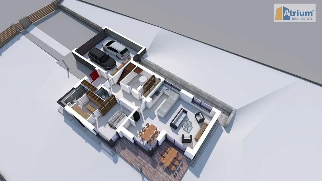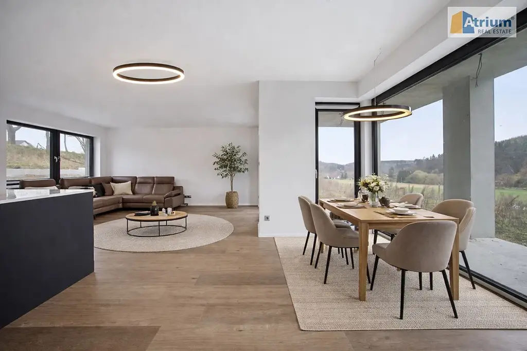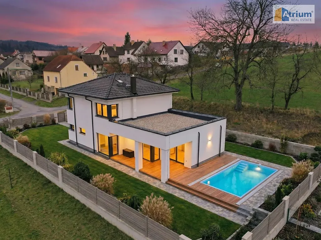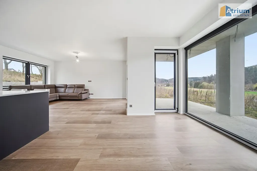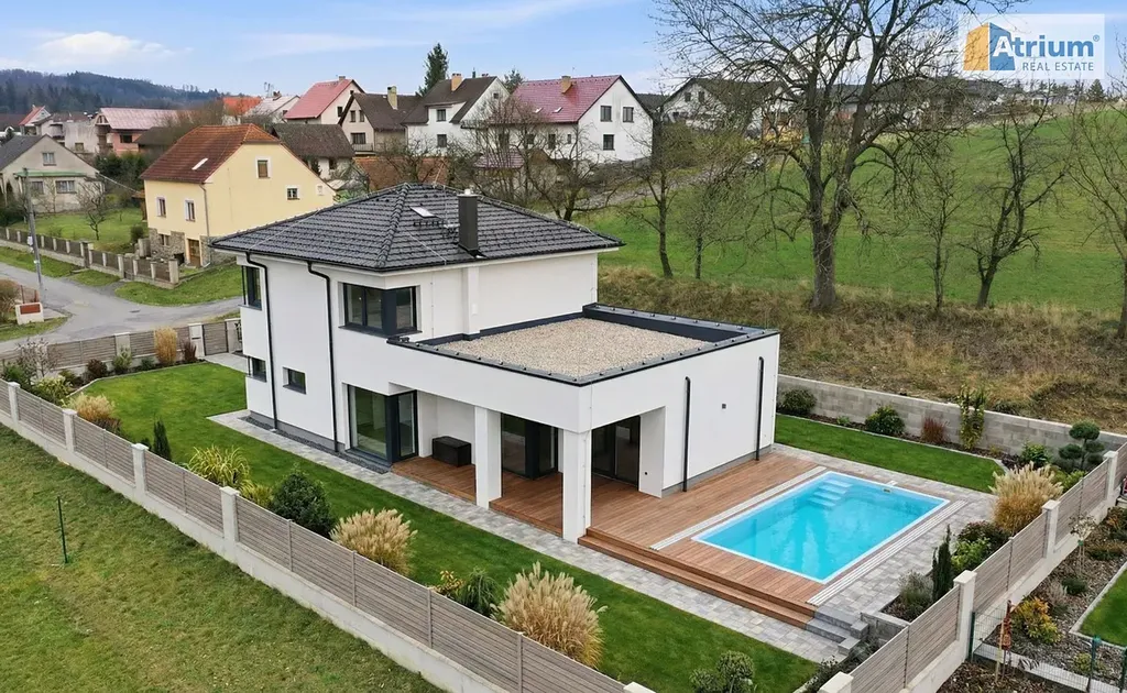 Luxusní dům, který byl postaven v roce 2025, nabízí celkovou užitnou plochu 194 m², zahrnující v přízemí prostorný obývací pokoj spojený s kuchyní /zn. SYKORA, deska je z tvrzeného kamene Technistone/, dále zde naleznete rodičovské apartmá /ložnice+šatna+koupelna s WC/, dále úložné prostory a technicklé zázemí domu. V prvním patře jsou umístěny 2 ložnice s dostatkem prostoru pro děti, pracovna, společná šatna a samozřejmě koupelna s WC. Dvě patra domu poskytují dostatek soukromí pro každého člena rodiny. Obrovskou výhodou tohoto RD je krásná terasa s výhledem do okolí, kde budete mít možnost trávit pohodové chvilky s rodinou či přáteli třeba u grilpovačky. Nesmíme ale zapomenout ještě na velkoryse navrženou garáž, která pojme pohodlně 2 auta a ještě zbyde dostatek místa pro uskladnění věcí či prostor pro kutila.