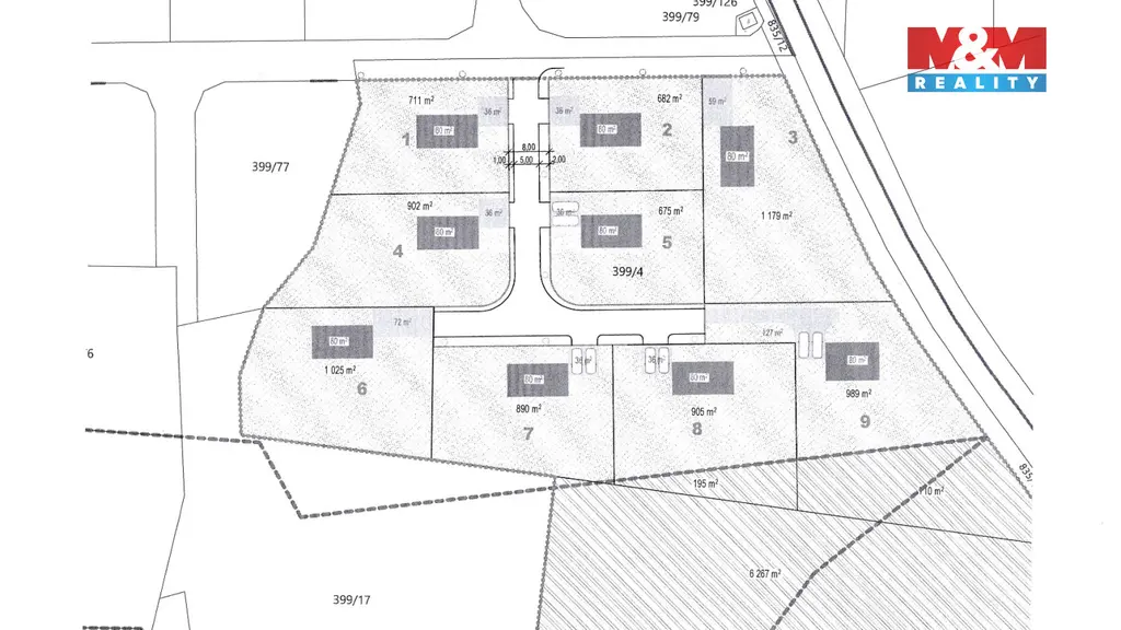 Prodej souboru pozemků o celkové výměře 15 939 m², z nichž 9 675 m² tvoří stavební část dle územního plánu pro nízkopodlažní rezidenční zástavbu — to je příležitost, která se v hranicích Prahy objevuje výjimečně. Lokalita Praha – Točná nabízí klid vilové čtvrti na jižním okraji hlavního města s přímým autobusovým spojením do centra. Infrastruktura je připravena nadstandardně: voda, kanalizace i elektřina jsou přivedeny na pozemek ve dvou přípojkách každá, nová asfaltová komunikace s veřejným osvětlením hotová. Projekt počítá s rozdělením až na 9 samostatných stavebních parcel o výměře 675 až 1 179 m² — ideální základ pro developera, investora i skupinu, která chce stavět společně. Dolní Břežany se vší občanskou vybaveností leží za humny, přírodní rezervace Šance a lesy podél Vltavy přímo za plotem.