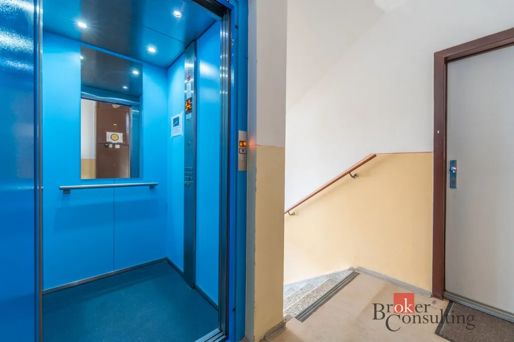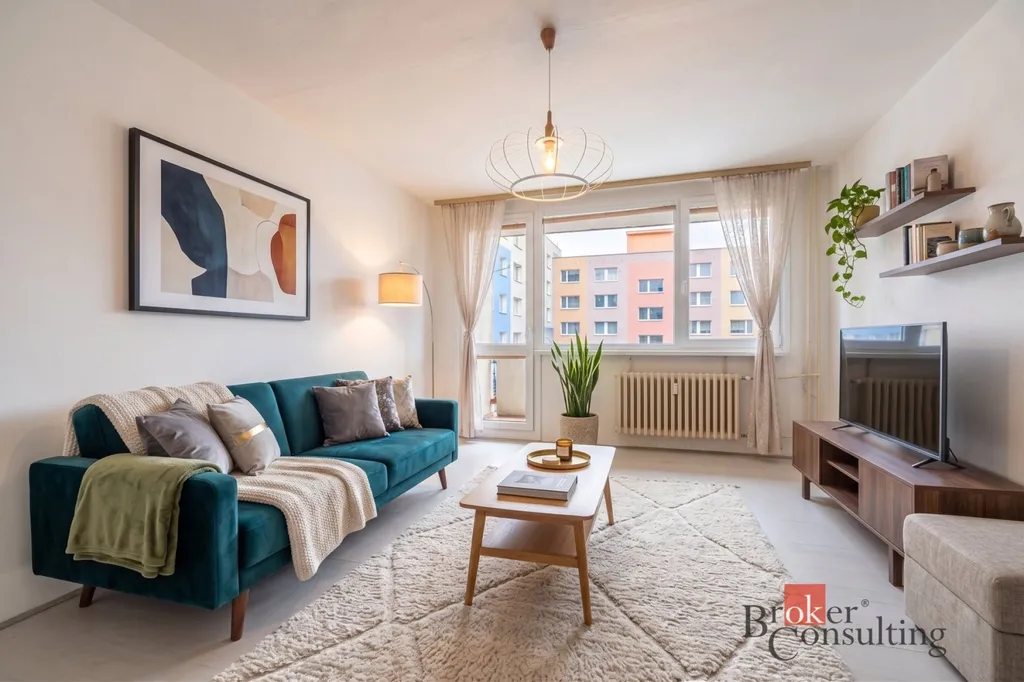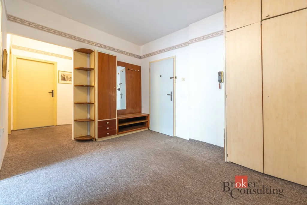 Interiér bytu tvoří tři samostatné pokoje, kuchyň a neobvykle prostorná chodba, která dává celému prostoru vzdušnost. Velkou výhodou je samostatná komora přímo v bytě, kterou lze využít jako šatnu nebo skladovací prostor, čímž odpadá nutnost řešit úložné prostory v obytných místnostech. Koupelna a toaleta jsou oddělené. Z obývacího pokoje je vstup na lodžii orientovanou do vnitrobloku mezi okolní zástavbu. K bytu samozřejmě náleží také sklepní kóje.