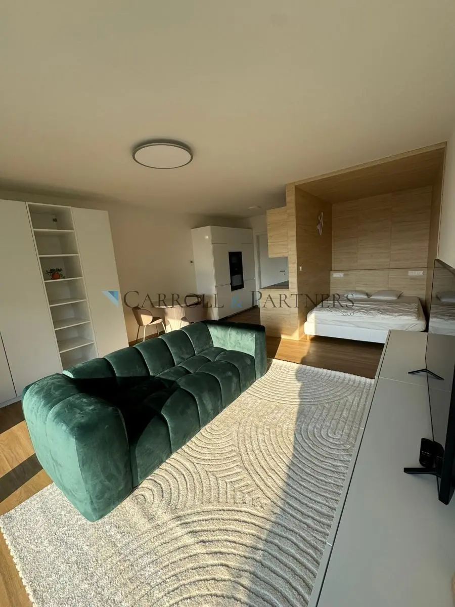 Kuchyň je plně vybavená vestavěnými spotřebiči (varná deska, trouba, mikrovlnka, lednice i myčka), takže se můžete hned pustit do vaření. Součástí bytu je také rozkládací jídelní stůl se židlemi, prostorné skříně, pohodlný gauč, stolek s televizí, koberec a postel o šířce 160 cm v oddělené spací zóně. Podlaha je vinylová a teplo je zajištěno podlahovým vytápěním i v koupelně.