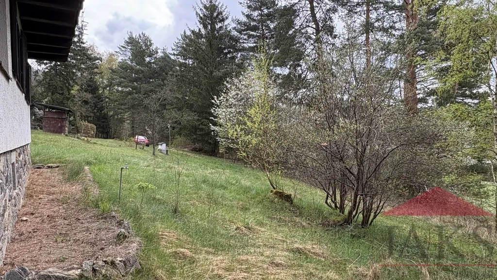 Popis: suterén: podsklepeno (sudy na vodu); přízemí: vstupní veranda, koupelna (sprcha a umyvadlo), sam. WC, obývací pokoj (kamna) s kuch. koutem (kuch. linka, lednice; plynový sporák s troubou na P.B., RV konvice, MV trouba, kávovar, el. boiler) a schodištěm do podkroví: velká ložnice se vstupem na balkon a ložnice.