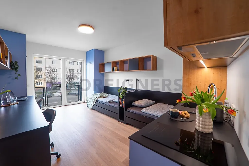 Studio dále zahrnuje 2 pracovní stoly s úložným boxem (vel. stolu 140 x 75 cm) + 2x židle; 2 jednolůžkové postele s úložným prostorem; 2 knihovny; 4 lampičky; magnetickou stěnu; 2 šatní skříně.