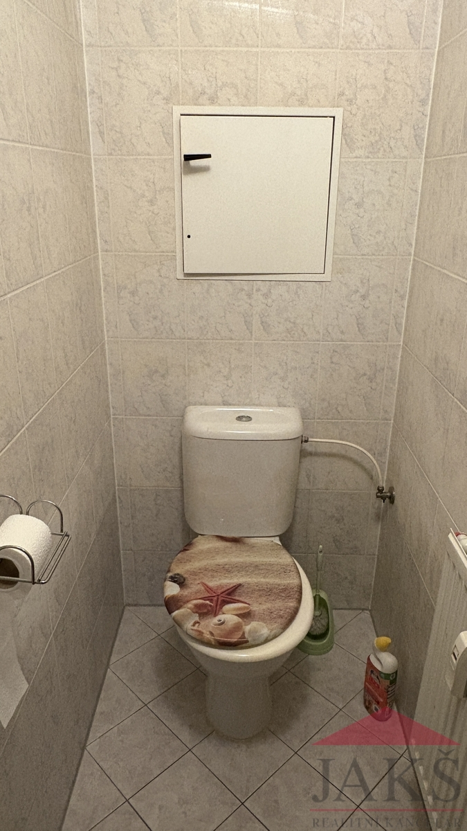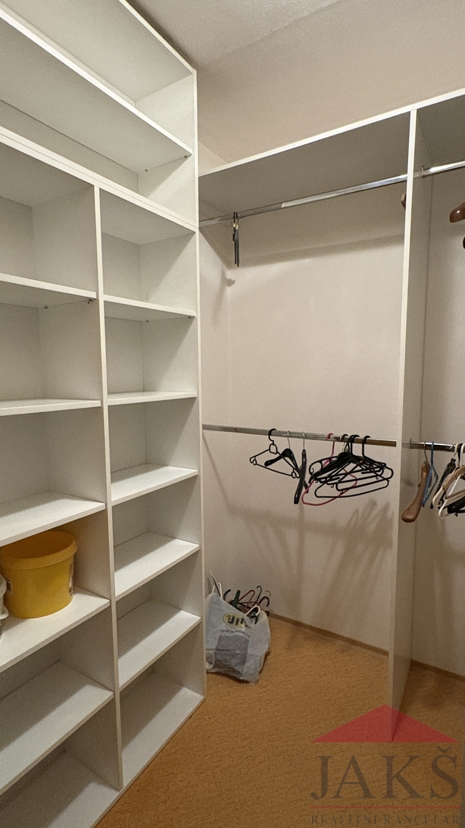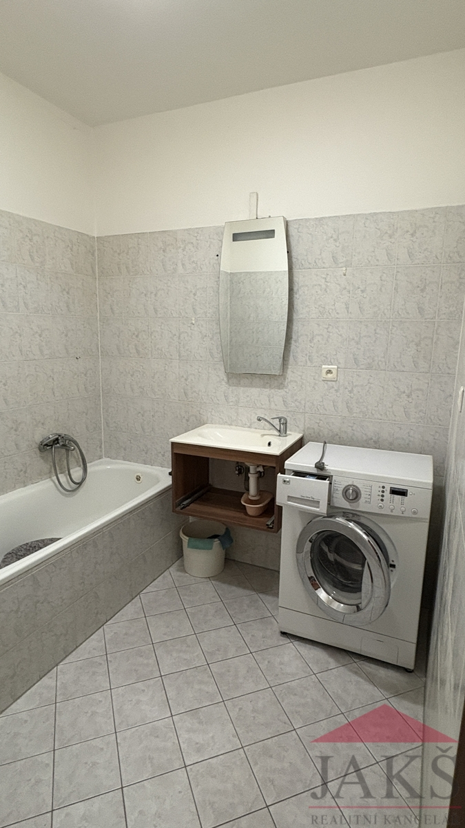 Popis: chodba 11,8 m2 (botník a věšák), šatna 3,9 m2 (regály), koupelna 4,5 m2 (vana, umyvadlo se zrcadlem, topný žebřík, pračka), samost. WC 1,2 m2, kuchyně 11,4 m2 (kuch. linka s HV troubou, myčkou, lednicí s mrazákem a digestoří) s jídelnou (jídelní stůl), obývací pokoj 16,4 m2 (rozkládací pohovka, konferenční stůl, skříň, stůl a dvě židle, lampa) a ložnice 16,7 m2 (gauč, skříň, lampa).