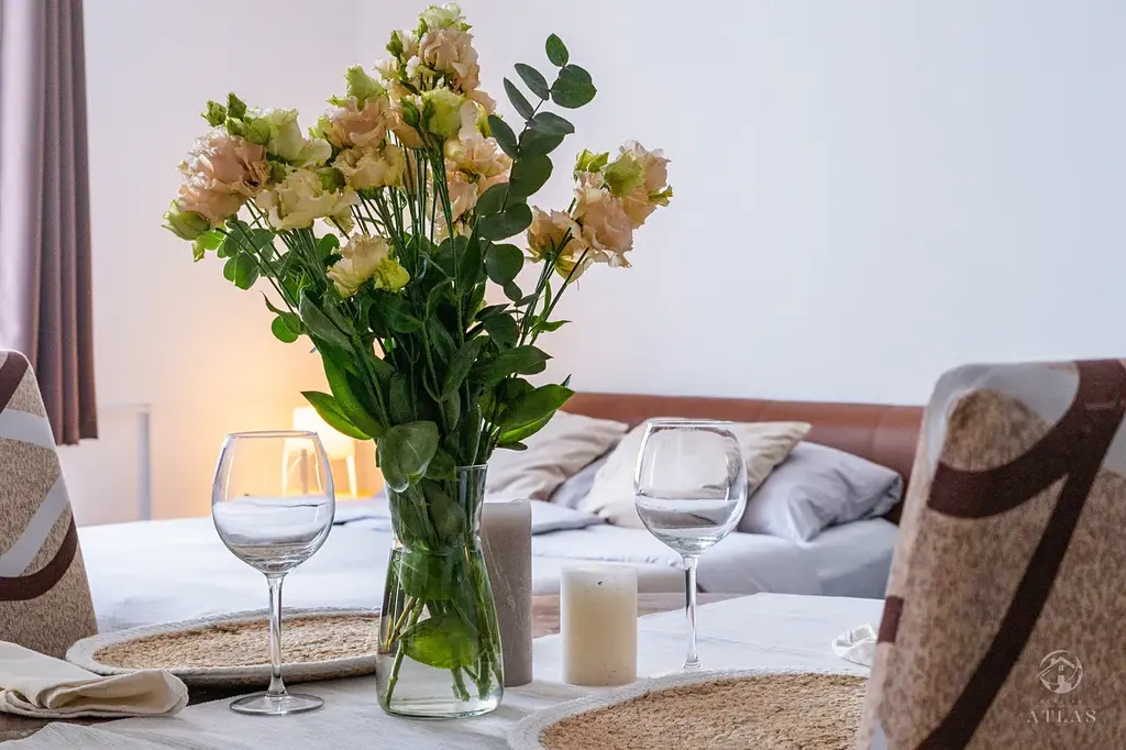 Interiér působí světlým a útulným dojmem, díky velkým oknům je byt krásně prosvětlen po celý den. Součástí vybavení je kuchyňská linka se spotřebiči, vestavné skříně, dostatek úložných prostor a možnost ponechání vybavení po dohodě.