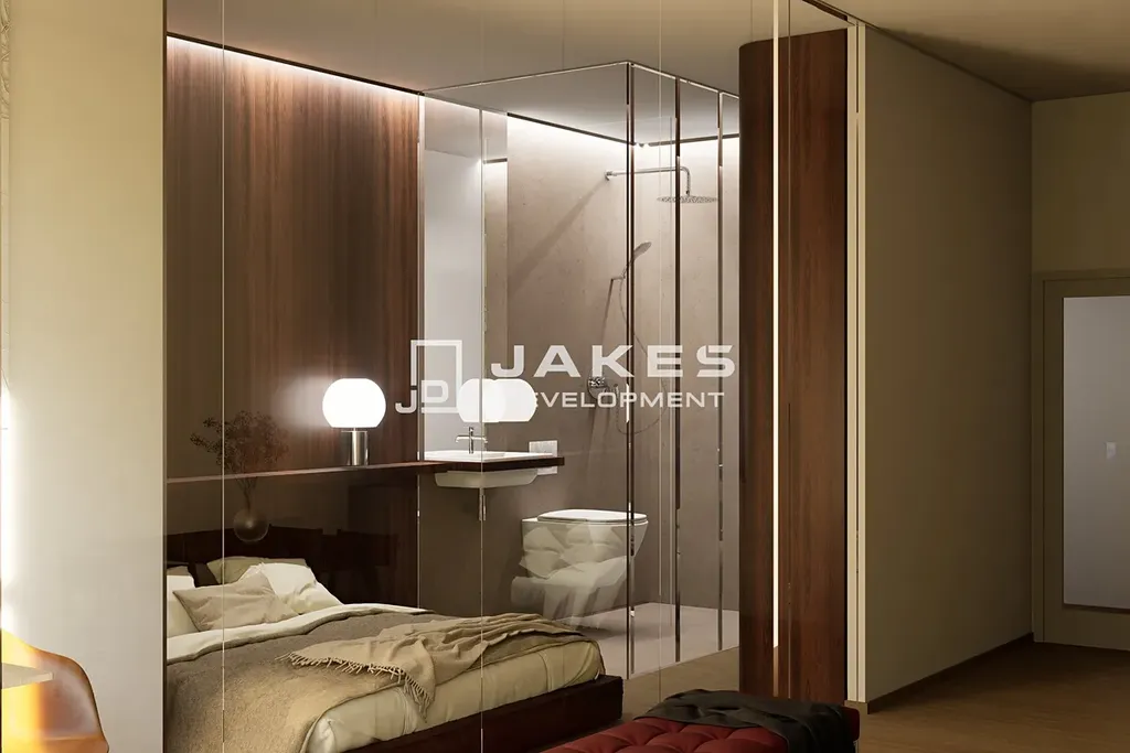 Bytová jednotka bude dokončena ve vysokém standardu, který zahrnuje kvalitní sádrové omítky, ambientní osvětlení a interiérové žaluzie. Koupelna nabídne podlahové vytápění, praktické niky ve sprchovém koutě a sanitu značky Laufen. V rámci klientských standardů je možné zvolit místo zděných příček elegantní skleněné příčky z velkoformátového kaleného skla od společnosti Jakes Glass, které dodají interiéru vzdušnost, více světla a pocit luxusu.