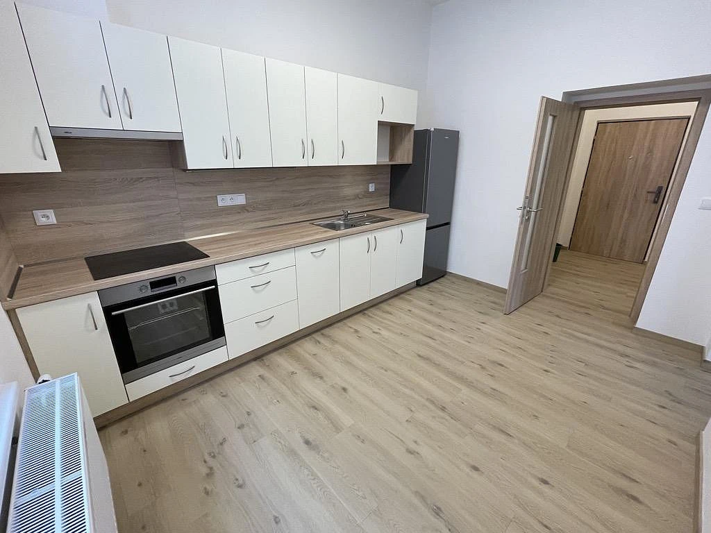 Byt je nabízen jako nezařízený, avšak s novým základním vybavením: kuchyňská linka, myčka, el. trouba, indukční varná deska, digestoř, lednice s mrazákem, úsporný kondenzační kotel