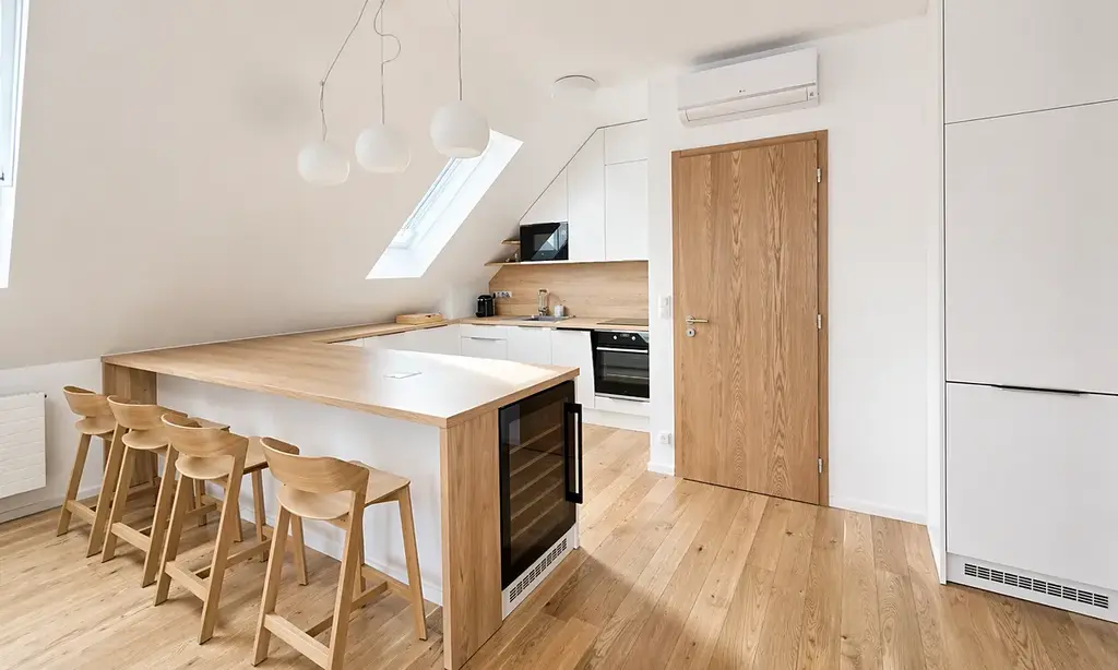 Byt splňuje nároky na moderní a komfortní bydlení ve vysokém standardu. Dominantou interiéru je designová kuchyňská linka vyrobená na míru, vybavená kvalitními vestavěnými spotřebiči – lednicí s mrazákem, indukční varnou deskou, horkovzdušnou troubou, vinotékou, myčkou nádobí a mikrovlnnou troubou.