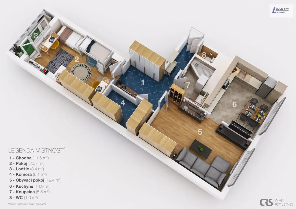 Celková plocha bytu je 78,8 m2 (kuchyně s jídelnou 14,8 m2, pokoje 20,7 a 19,4 m2, zvětšená koupelna o chodbu do kuchyně cca 5,5 m2, WC 1 m2, předsíň 11,6 m2, komora v bytě 6,1 m2 a sklepník koje 2,2 m2. Lodžie 3,4 m2 se nezapočítává do výměry bytu.