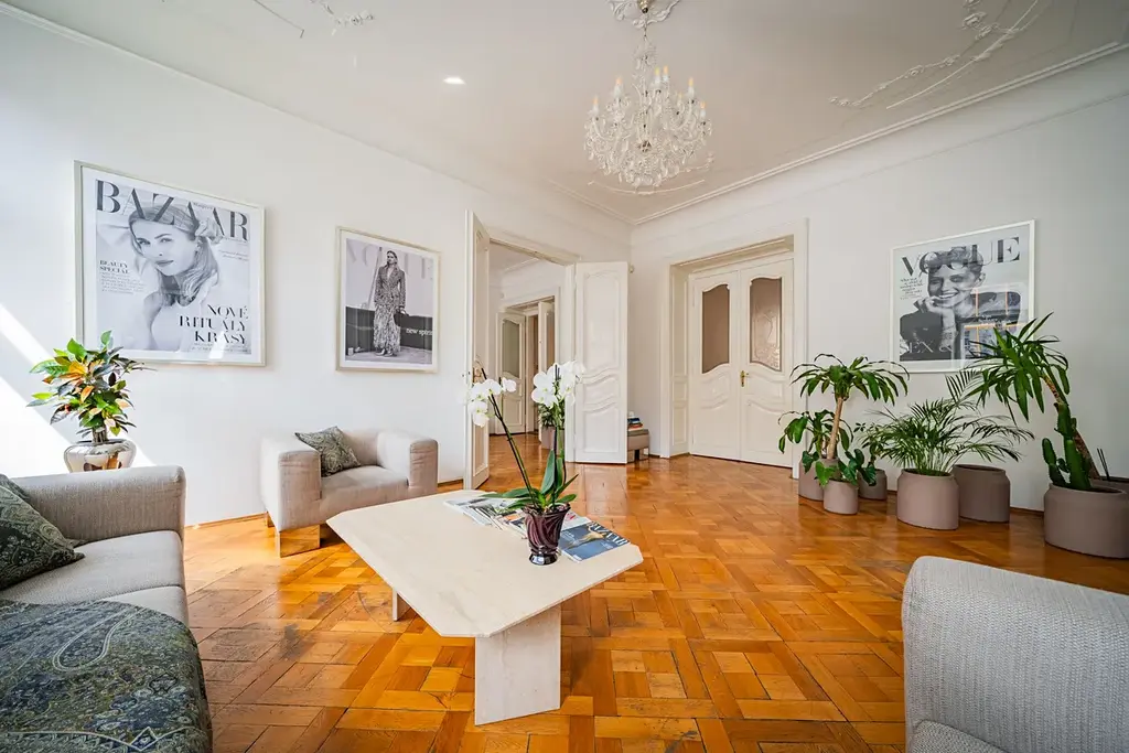 Tento výjimečný byt v sobě spojuje noblesu klasické architektury s komfortem moderního bydlení. Interiér bytu prošel pečlivou rekonstrukcí s důrazem na zachování původních řemeslných detailů, jako jsou vysoké stropy, dvojkřídlé kazetové dveře, původní dřevěné parkety a velkoformátová okna, která dodávají prostoru velkorysou vzdušnost a množství přirozeného světla.