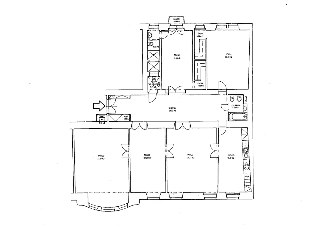 Dispozičně je byt řešen velmi prakticky i reprezentativně – nabízí 5 prostorných a impozantních pokojů, samostatnou kuchyni s plně vybavenou kuchyňskou linkou a vestavěnými spotřebiči (včetně myčky, lednice s mrazákem, varné desky, trouby), dvě koupelny (jedna s vanou, druhá se sprchovým koutem), samostatnou toaletu se sprškou, vstupní halu.