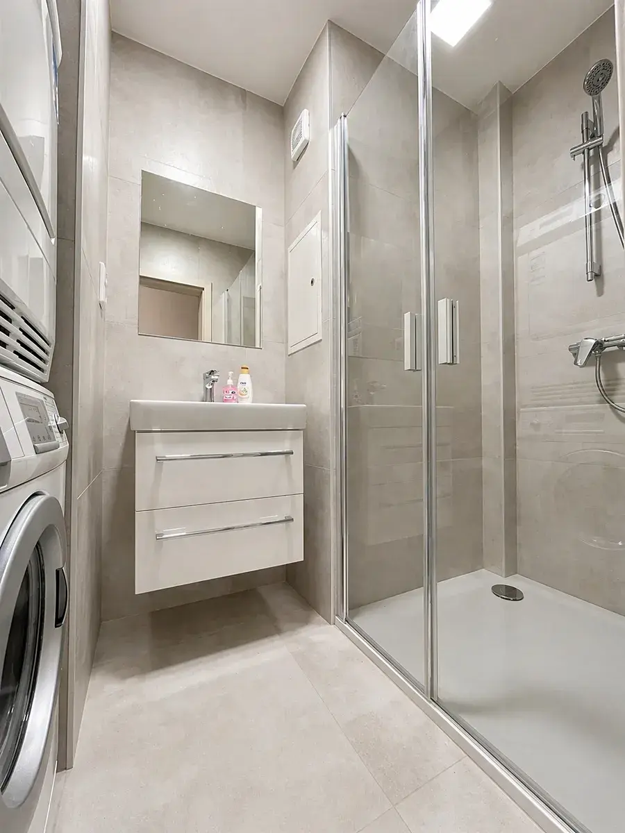 Dispozice bytu je velmi dobře řešená – kuchyňský kout je umístěn samostatně v rohu s vlastním oknem. Kuchyňská linka do tvaru L je vybavena myčkou, troubou, varnou deskou a lednicí s mrazákem. Samostatné WC. V koupelně se nachází prostorný, moderně řešený sprchový kout (dlažba, skleněné dvoukřídlé dveře), pračka a sušička.