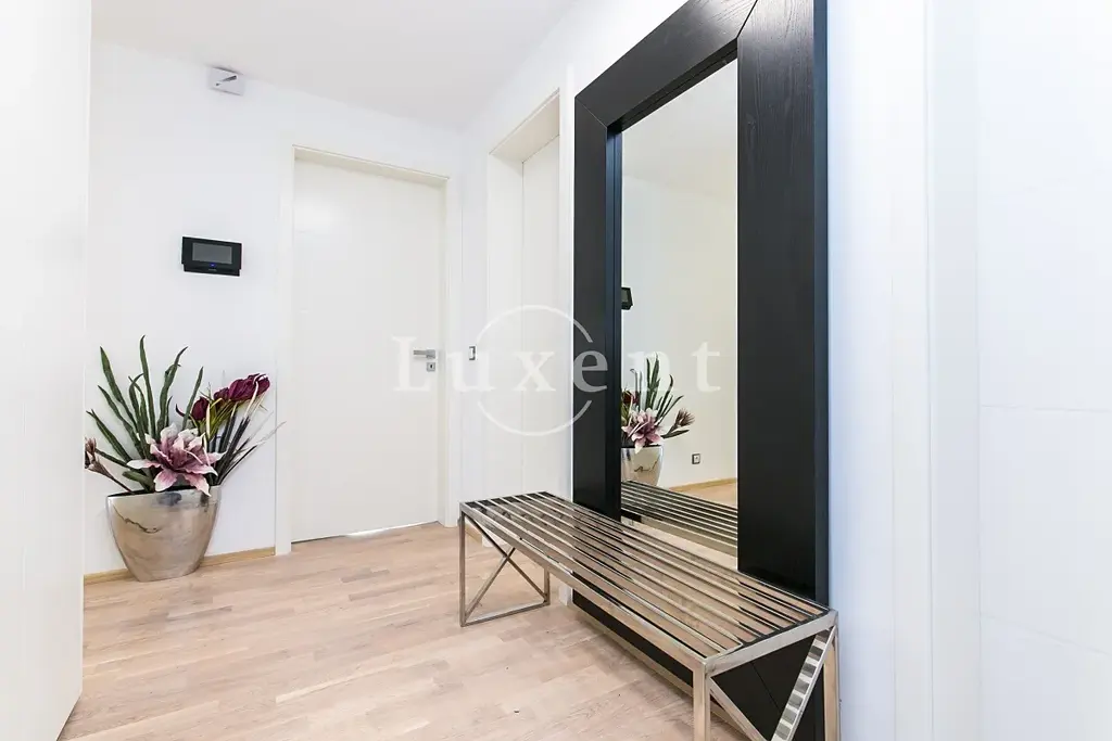 Dispozice nabízí vstupní chodbu, prostorný obývací pokoj s kuchyňským koutem, dvě ložnice, dvě koupelny s toaletou, šatnu a technickou místnost. Kuchyň je vyrobena na míru a kompletně vybavena všemi spotřebiči značky Miele. Ze všech pokojů je vstup na terasu, mnoho úložných prostor a vestavěných skříní, tři televize, pračka. Dřevěná podlaha a dlažba, velká francouzská okna s izolačním trojsklem, bezpečnostní a protipožární dveře. Provoz bytu zajišťuje inteligentní systém – ovládání LED a RGB světel, rolet a žaluzií, centrální sytém větrání v projektu.