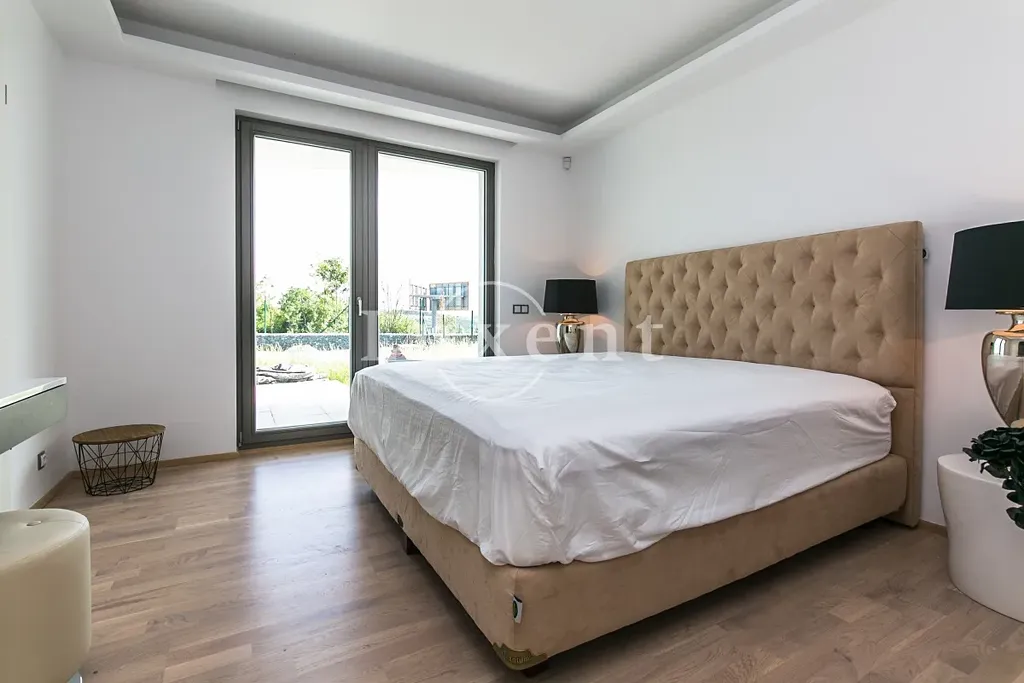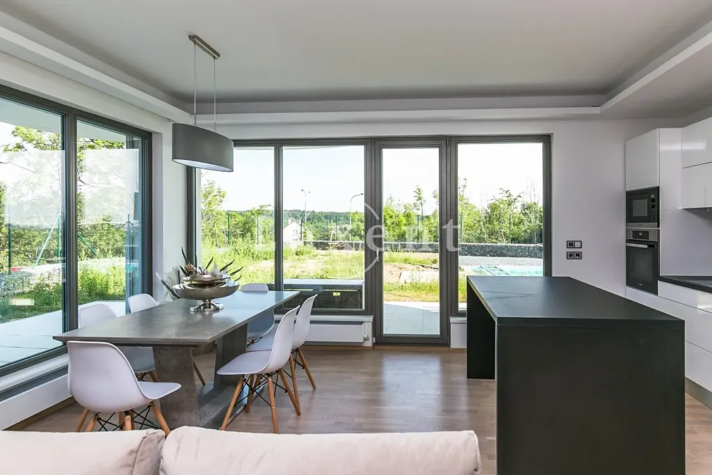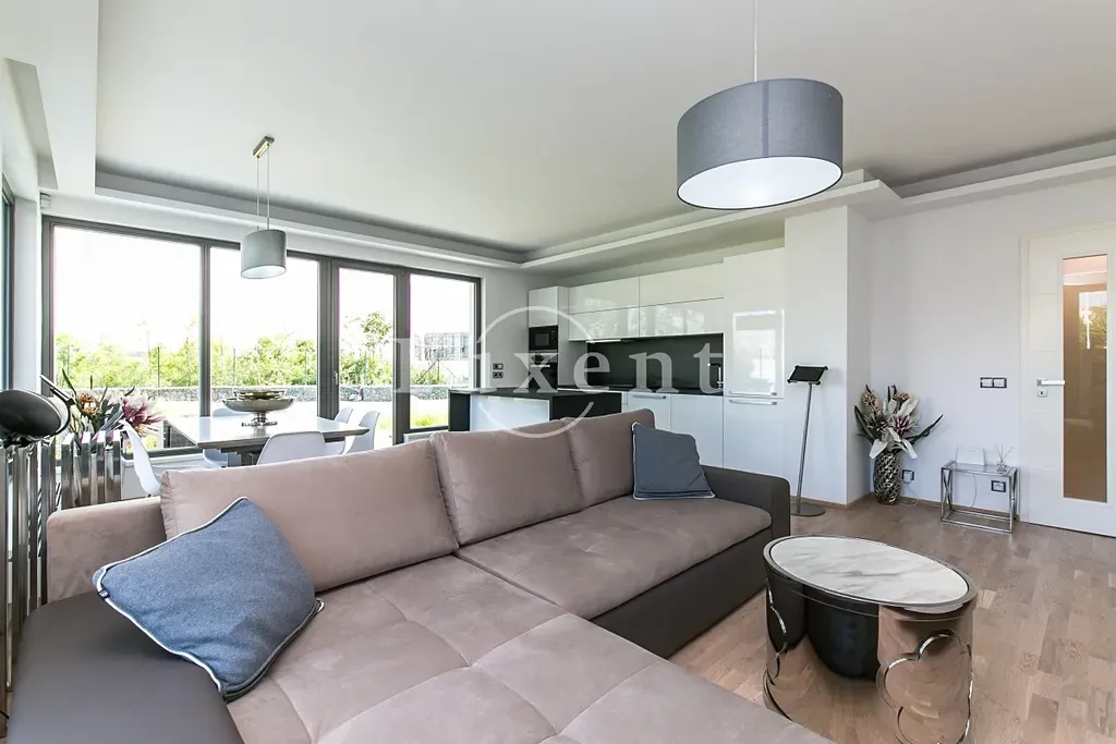 Nabízíme k pronájmu kompletně zařízený byt 3+kk o obytné ploše 91,3 m², který je součástí rezidence Sky Barrandov. Byt je situován v přízemí, součástí je velká terasa (64,9 m²), privátní zahrada (316,1 m²) a bazén. K bytu náleží dvě garážová stání, která jsou zahrnuta v ceně.