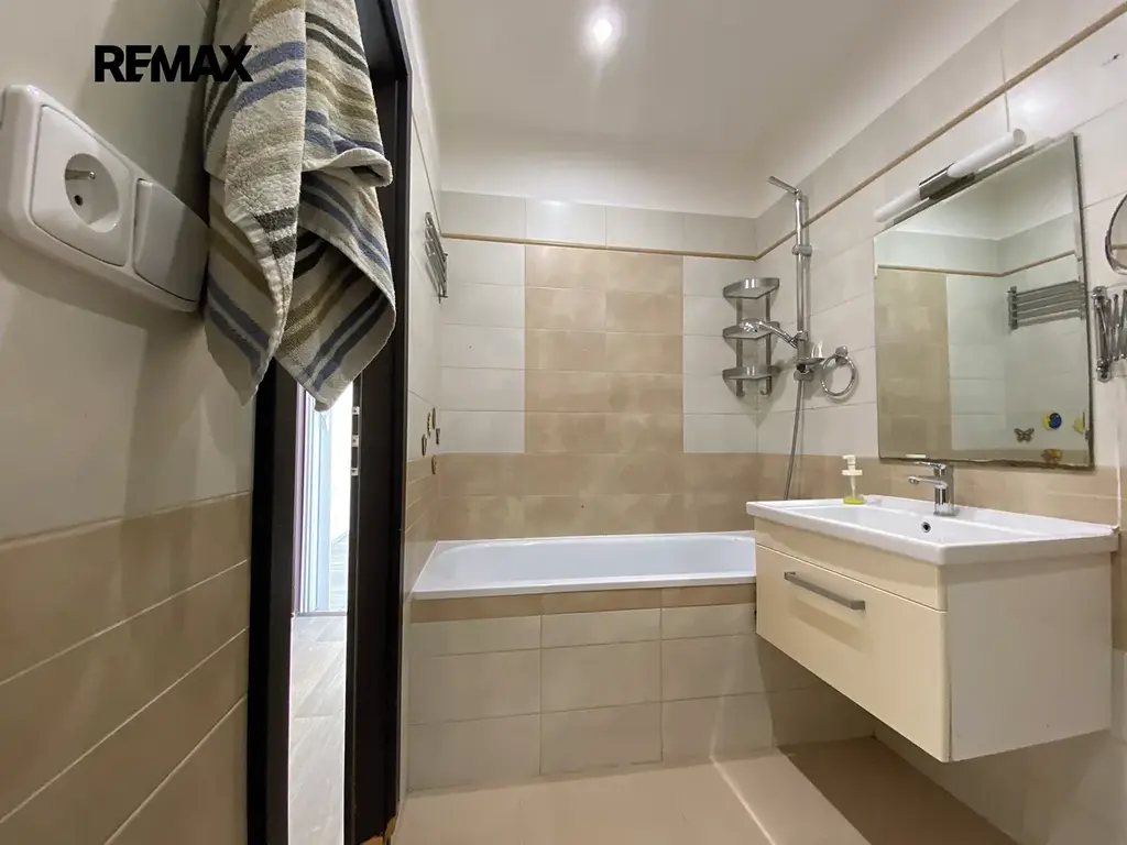 V bytě je dostatek prostoru pro umístění pračky i sušičky. Kromě dvou prostorných, samostatných pokojů je k dispozici také menší šatna, která poskytuje další úložný prostor.