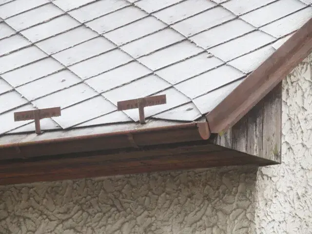 sedlová s krytinou z osinkocementové šablony. Na střeše jsou žlaby se svody. Klempířské