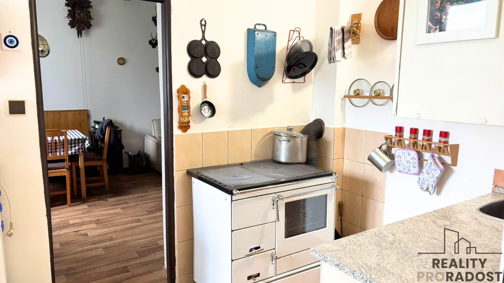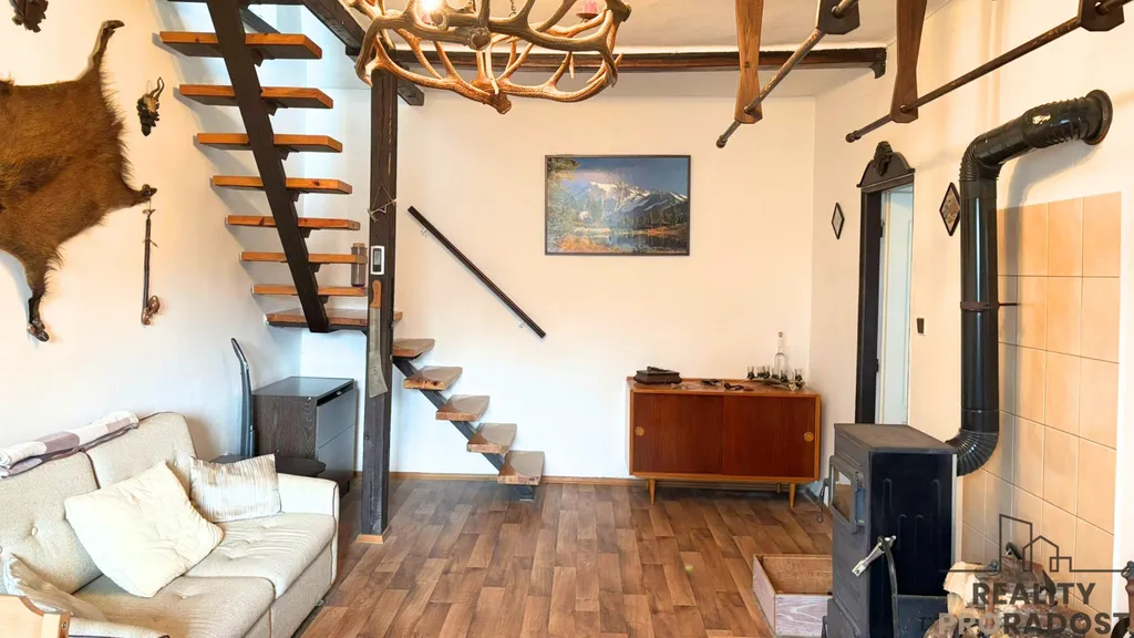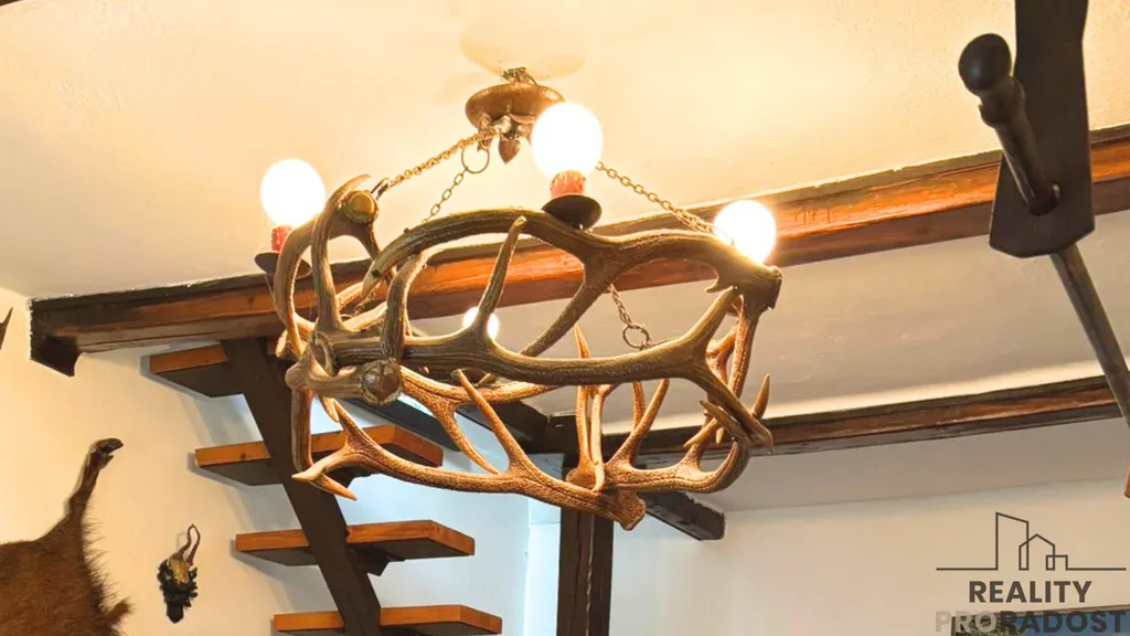 Dispozice nabízí verandu, předsíň, kuchyni, ložnici a hlavně prostorný obývací pokoj, který je srdcem celého domu. Právě zde najdete výrazný lustr, který dodává prostoru jedinečné kouzlo.
