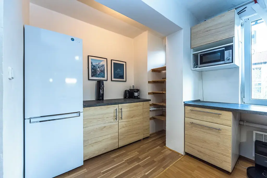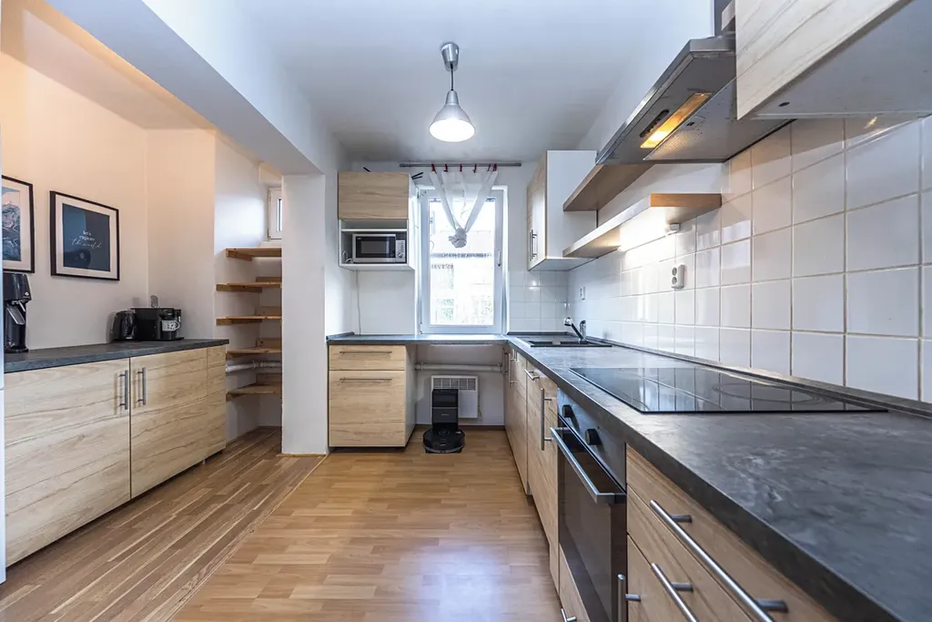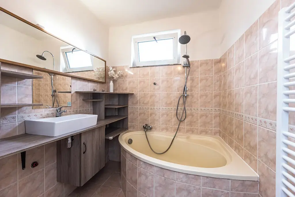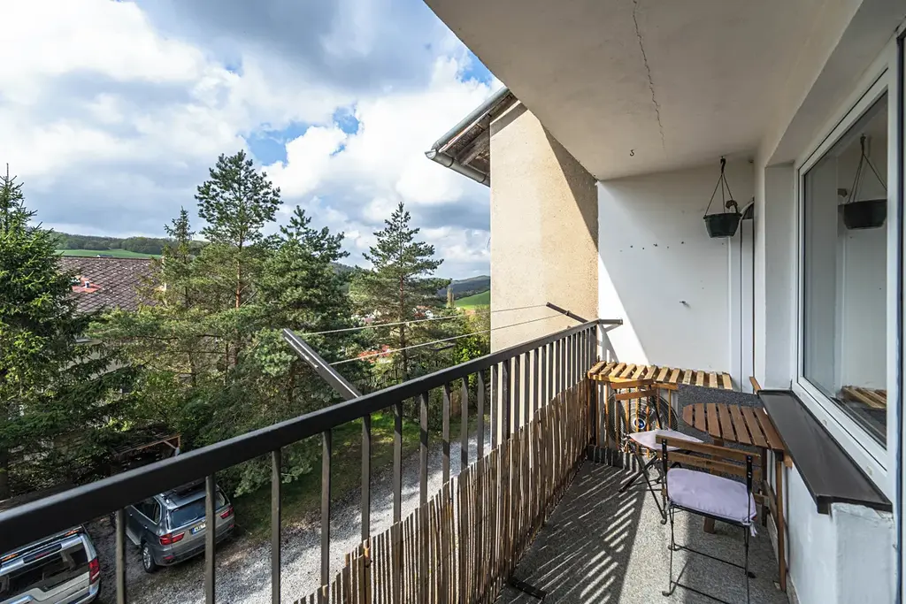 Bytová jednotka 3+1 s lodžií situovaná ve 2.patře zděného bytového domu s vlastní garáží 20,9 m2 a dílnou 11,2 m2. Tento slunný byt zahrnuje obývací pokoj, 2x ložnici, prostornou chodbu, kuchyni, koupelnu s vanou, samostatné WC a technickou místnost. Orientace pokoje s lodžií a obývacího pokoje je na jih, zbytek bytu pak na sever. Jednotka je ve velmi dobrém udržovaném stavu po průběžných opravách (rozvody, plastová okna, štuky, výmalba, plovoucí podlahy, vytápění, kuchyňská linka, ...). Vytápění je elektrické převážně novými klimatizačními jednotkami, ohřev vody el. zásobníkovým ohřívačem, v domě je k dispozici plyn, který může být využit jako alternativní zdroj vytápění. Bytový dům pouze se 4 byty je řádně spravován fungujícím SVJ. Dále možnost užívat 1/4 rozlehlé půdy situované nad prodávaným bytem či domluvit rozšíření bytu.