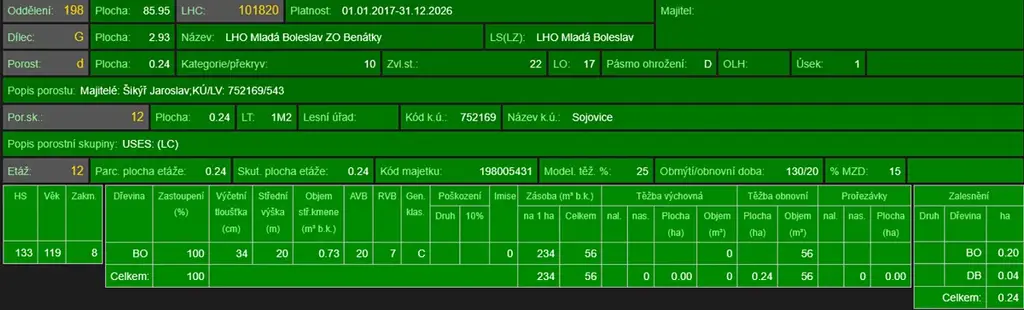 - p.č. 339/2 vedená jako lesní pozemek o celkové výměře 2 408 m2, z toho vlastníme podíl 1/2 tedy 1 204 m2 (stáří lesa 128 let - zastoupení dřevin borovice).
