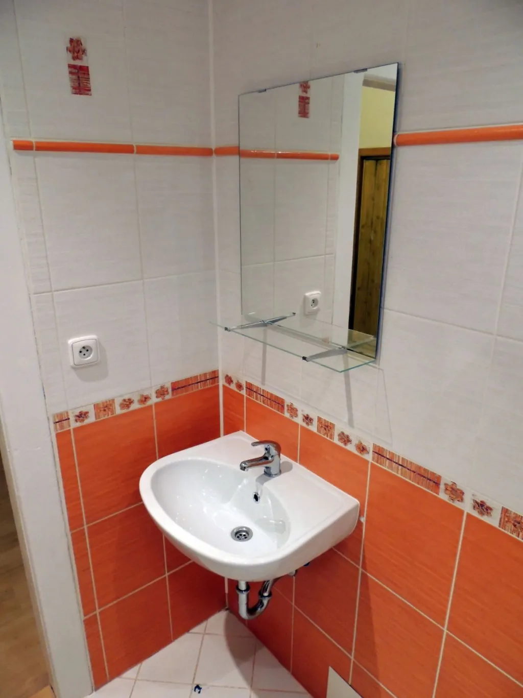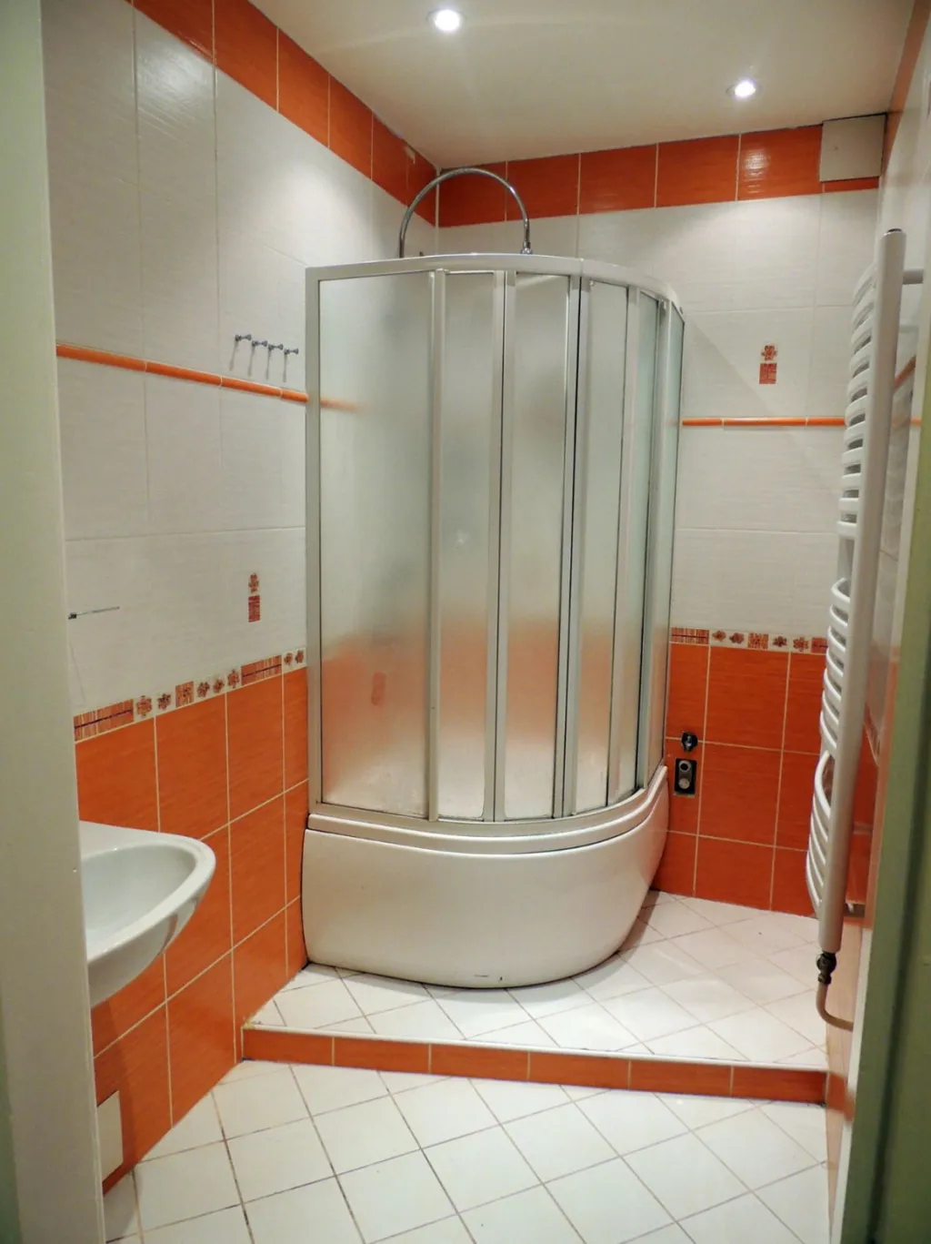 Koupelna se sprchovým koutem a možností připojení pračky. Toaleta je oddělena.