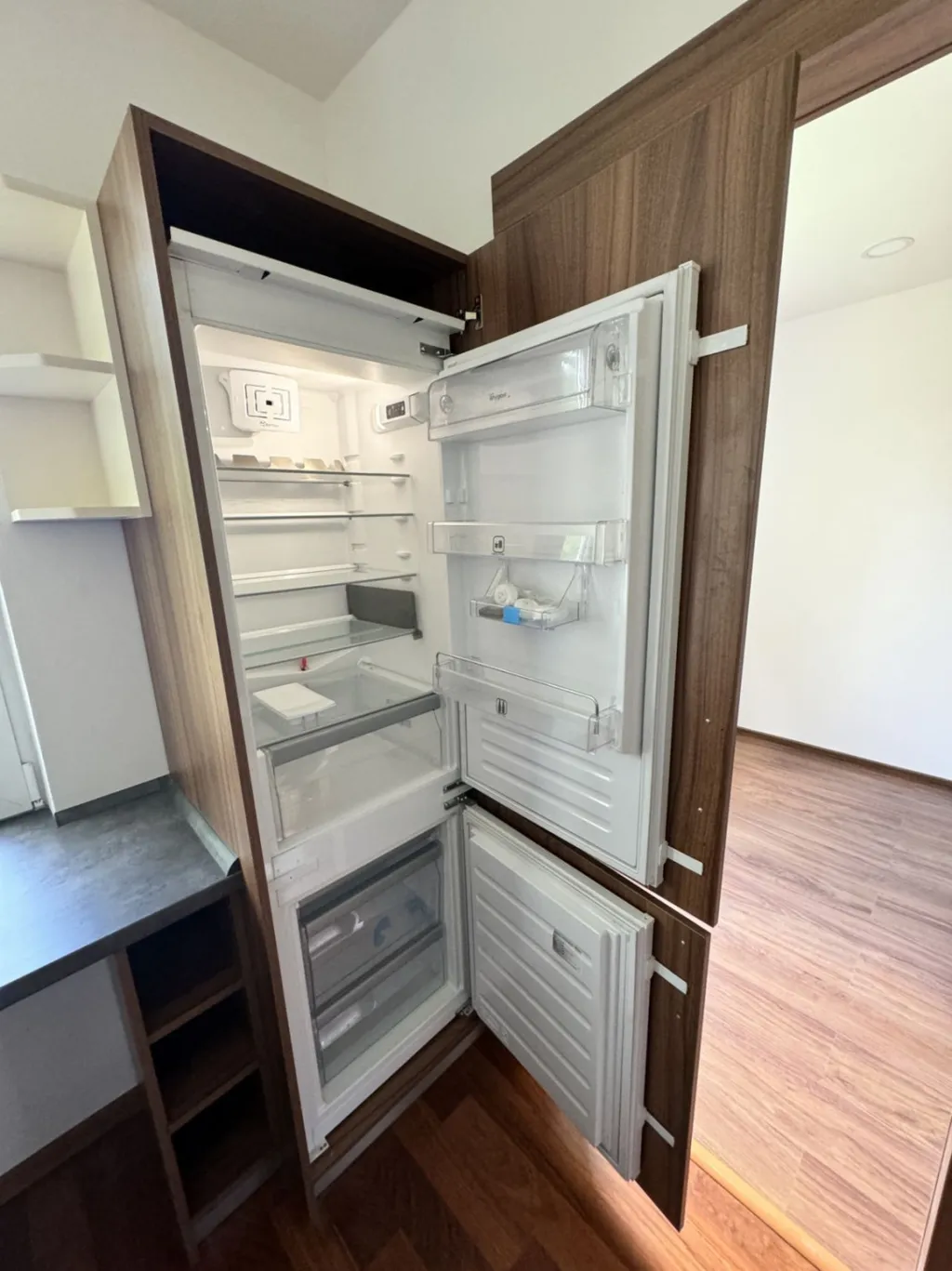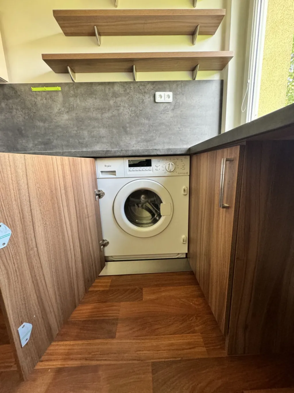 Kuchyňská linka je opatřena vestavěnými spotřebiči (sklo keramická deska, elektrická trouba, digestoř, myčka, lednice, pračka).