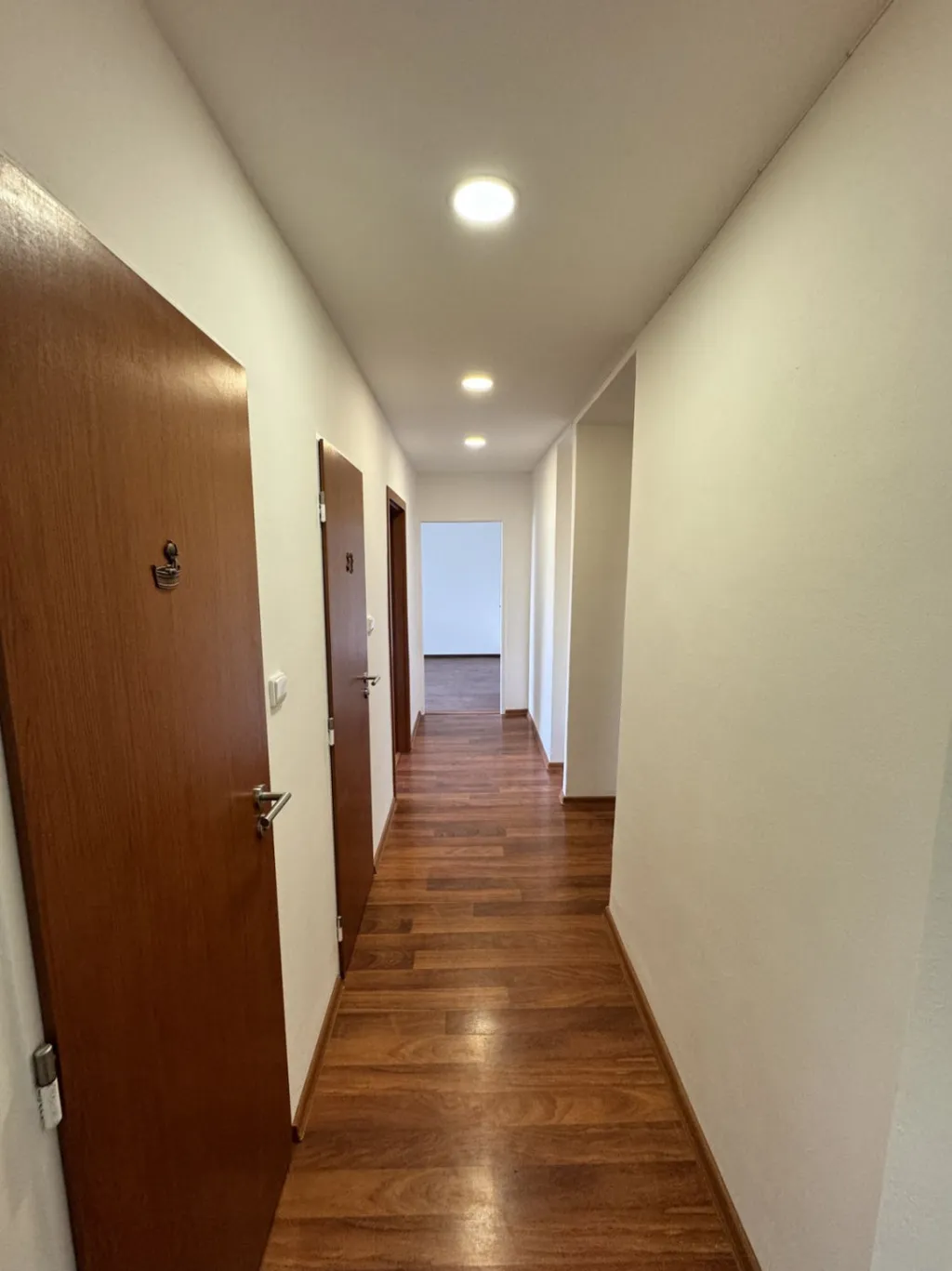 Z chodby se dostaneme do dvou neprůchozích pokojů a třetí pokoj je průchozí do kuchyně. Místnost u kuchyně lze využít například jako jídelnu.