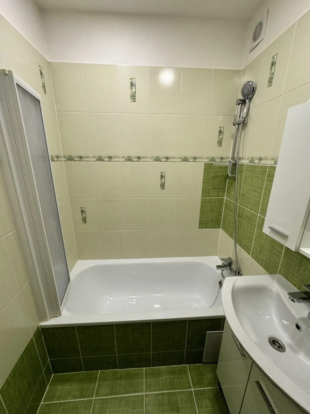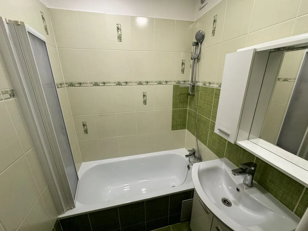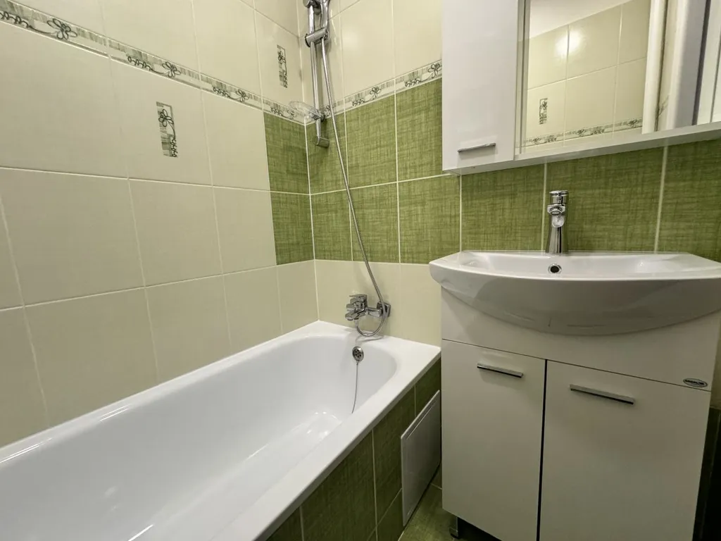 Koupelna disponuje vanou se zástěnou, umyvadlem se skřínkou a osvětlením. Toaleta je umístěna samostatně.