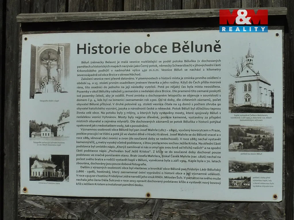 Běluň, Brzice, Kohoutov - vyhledávaná rekreační oblast nedaleko Dvora Králové nad Labem, Jaroměře a okresního města Trutnov. Soubor travnatých pozemků s dřevinou, výměra 1374 m2 a půdorysem minulé stavby o výměře 79 m2. Pozemky po úpravě vhodné k rekreaci nebo pro bydlení v klidné lokalitě obce katastrálního území Brzice. Půdorys minulé stavby označené jako společný dvůr bude možno po stavebním povolení využit pro novou stavbu. Dálnice D11 do 20 minut. Okresní město Trutnov také do 20 minut do centra autem a Hradec Králové nedaleko po nové dálnici. Pozemek má ideální tvar obdélníku a navazuje na přístupovou obecní komunikaci. Objekt je umístěn na okraji obce. V dosahu také nedaleko rekreační oblasti Krkonoše, Zoologická zahrada se safari, přehradní nádrž Rozkoš, Orlické hory, Adršpašsko Teplické skály a dalších turistických míst Náchodska, Trutnovska a Broumovského výběžku. Ideální klidné tiché místo pro hospodářskou realizaci nebo bydlení a rekreaci.