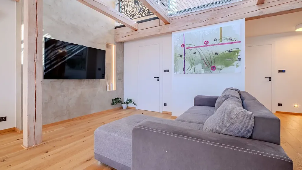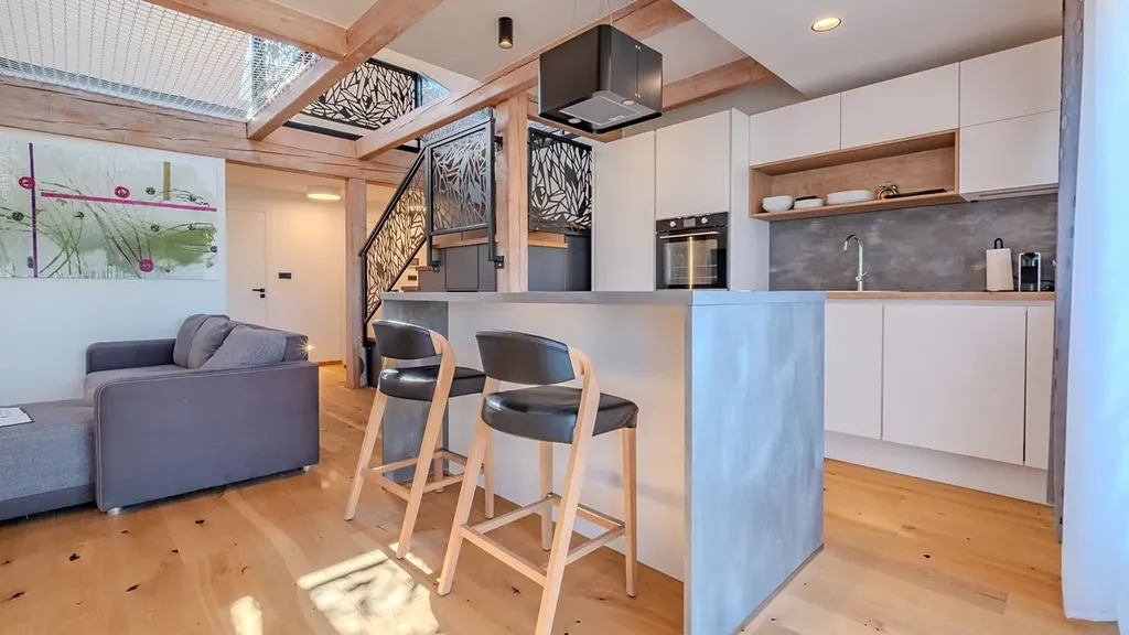 Okna s izolačním trojsklem (REHAU GENEO) zajišťují výbornou tepelnou pohodu, součástí je i bezprahový HS portál na lodžii s přípravou na venkovní stínění. Interiér dotváří designové dveře značky Sapeli se skrytými panty a magnetickými zámky. Součástí bytu je plně vybavená kuchyňská linka.