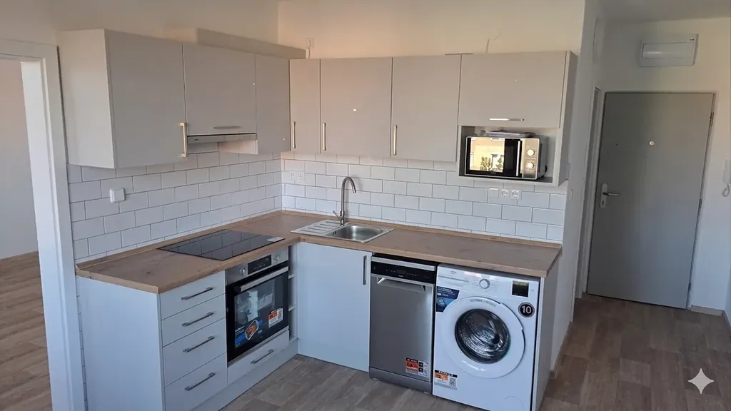 Kuchyňská linka je vybavena vestavěnými spotřebiči – mikrovlnná trouba, varná indukční deska, pečící trouba, digestoř, myčka nádobí a pračka.