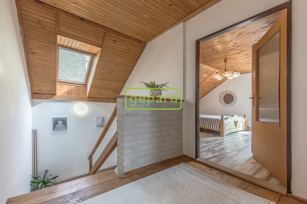 V patře najdete klidovou zónu domu – hlavní ložnici s vlastní koupelnou, šatnou a dokonce i infrasaunou. Dva další pokoje snadno poslouží jako dětské pokoje nebo pracovna. Bonus navíc? Krytá lodžie, ideální na ranní kávu nebo večerní klid.