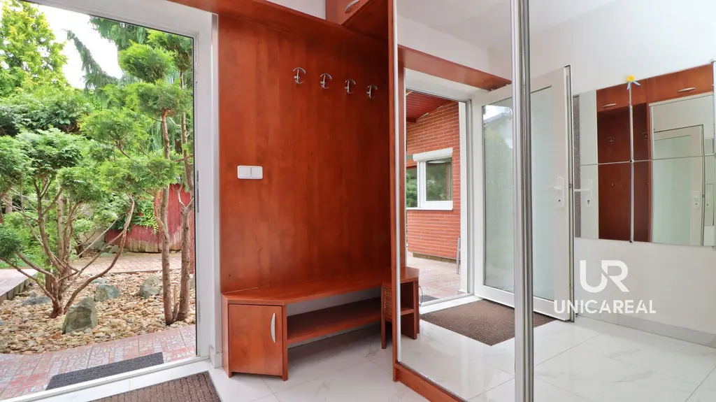 • K domu náleží také okrasná zahrada v japonském stylu s jezírkem a zahradním domkem, která dotváří jedinečnou atmosféru domu. Zahrada má velikost 785m², je prosluněná a do detailu vyladěná. Z terasy o velikosti 17,16m² se můžete večer kochat krásnými pohledy na osvětlenou zahradu.