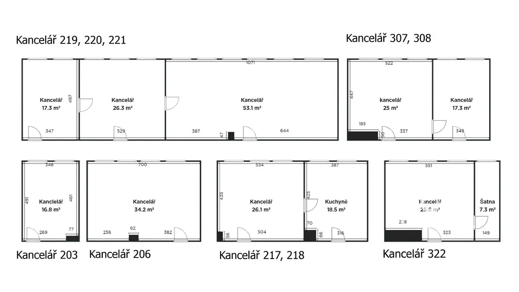 Kanceláře se nachází ve 3. NP, výměry jednotlivých kanceláří: