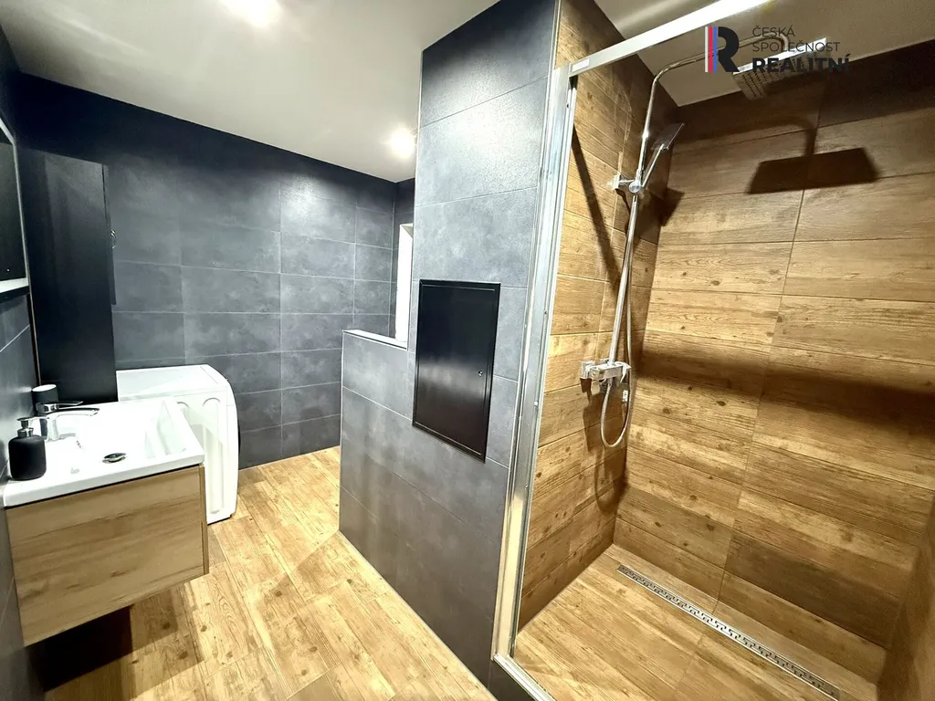 Koupelna s WC je řešena v nadčasovém designu s kombinací velkoformátové dlažby a dekoru dřeva, nechybí sprchový kout ani prostor pro pračku. Ve všech obytných místnostech je položena kvalitní vinylová podlaha, pouze v koupelně s WC a na lodžii je dlažba.