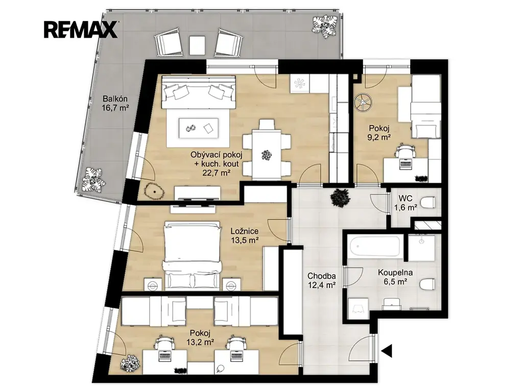 Dominantou bytu je velký balkon o rozloze téměř 17 m², který poskytuje krásný výhled do okolí a dostatek prostoru pro relaxaci i posezení s rodinou či přáteli.