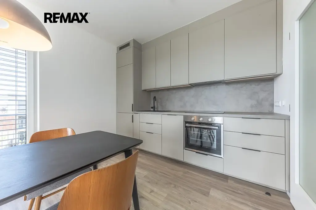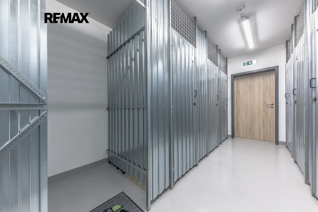 Byt je vybaven kvalitní kuchyňskou linkou se spotřebiči (myčka, sklokeramická deska, trouba, lednice s mrazákem, dřez). Nechybí ani vestavěné skříně a botník, které zajišťují dostatek úložného prostoru. K bytu náleží také sklepní kóje o velikosti cca 2 m².