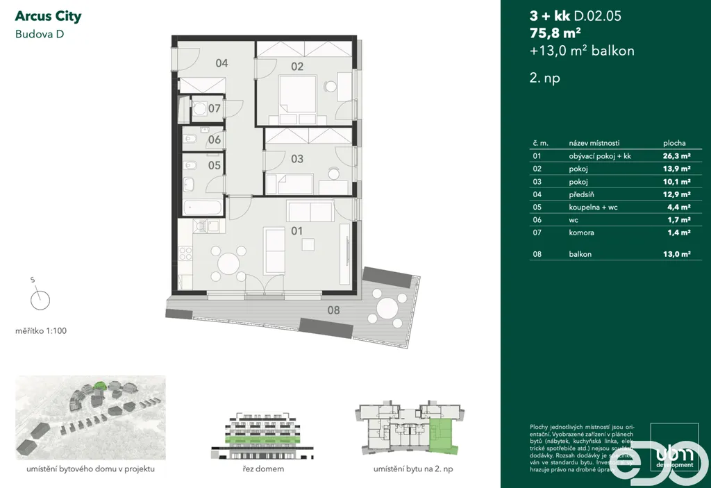 Bytová jednotka o celkové užitné ploše 94,8 m² se nachází ve 2. podlaží skeletové řadové novostavby a byla obydlená pouze přibližně 2 roky. Užitná plocha bytu, tedy plocha obytných místností uvnitř vnějších stěn nemovitosti, je 76,3 m². Skládá se z chodby s vestavěnou skříní na míru, dvou pokojů, obývacího prostoru s kuchyní na míru (německé high-quality značky Nobilia), koupelny s vanou, WC a umyvadlem, dalšího samostatného WC s umyvadlem, komory a balkonu (15,3 m²), který je přístupný z obývacího pokoje. Pokoje jsou situovány na jihovýchod. Co se týče spotřebičů, tak kuchyně disponuje indukční varnou deskou s digestoří, vestavěnou myčkou, mikrovlnnou troubou, elektrickou troubou a lednicí s mrazákem. Vše značky Siemens. K bytové jednotce dále náleží zděný sklep (3,2 m²) a garážové parkovací stání. Je zde také možnost využívat kočárkárnu či kolárnu.