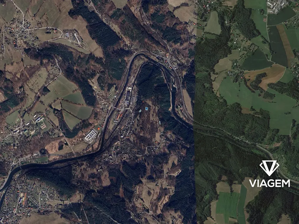 ➡️ Kombinace zeleně, lesního pozemku a komunikace.