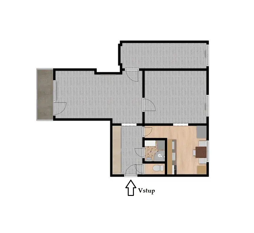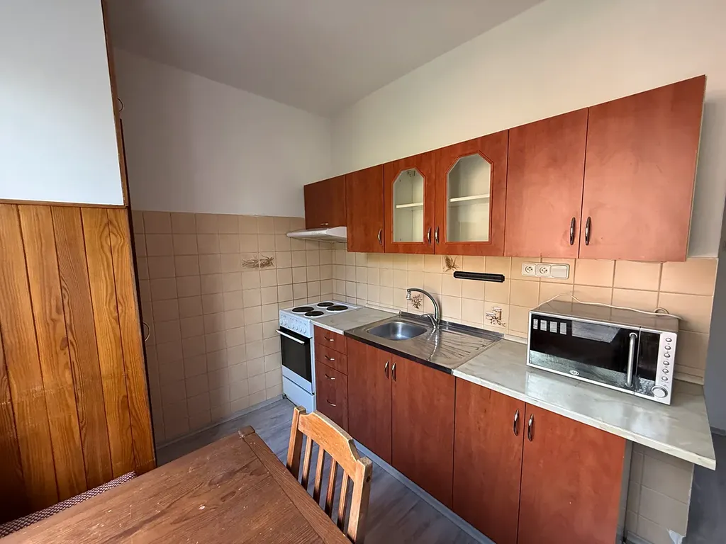 Vstupními dveřmi vejdeme do velké předsíně s vestavěnými skříněmi o velikosti cca 6,12 m2, ze které je následně vstup do dalších místností. V předsíni se nachází samostatná toaleta o velikosti cca 0,8 m2 a koupelna o velikosti cca 2 m2, která disponuje sprchovým koutem a umyvadlem. Z předsíně je také vstup do prostorné kuchyně o velikosti cca 9 m2, která je vybavena sporákem s pečící troubou, ledničkou s mrazákem a spížkou. Na konci chodby je vstup do obývacího pokoje o velikosti cca 21,7 m2, ze kterého je vstup na balkón o velikosti cca 4 m2 s krásným výhledem do zeleně. Na pravé straně obývacího pokoje se nachází vstup do ložnice o velikosti cca 12,8 m2. Poslední pokoj je o velikosti cca 9,3 m2.