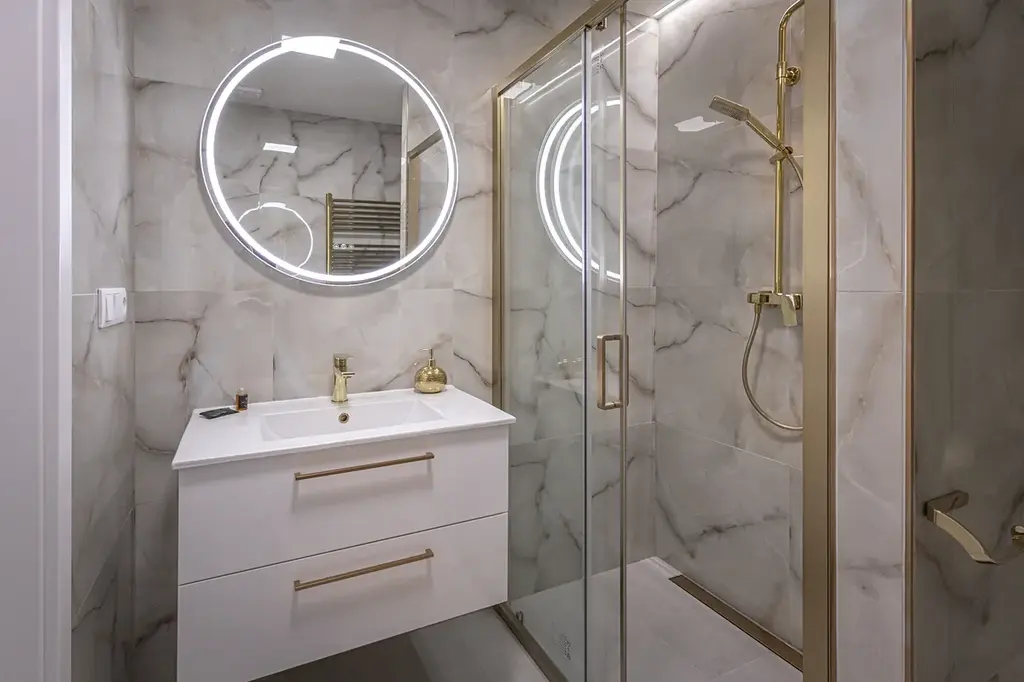 - prostorná koupelna se zlatými prvky, vanou i sprchovým koutem