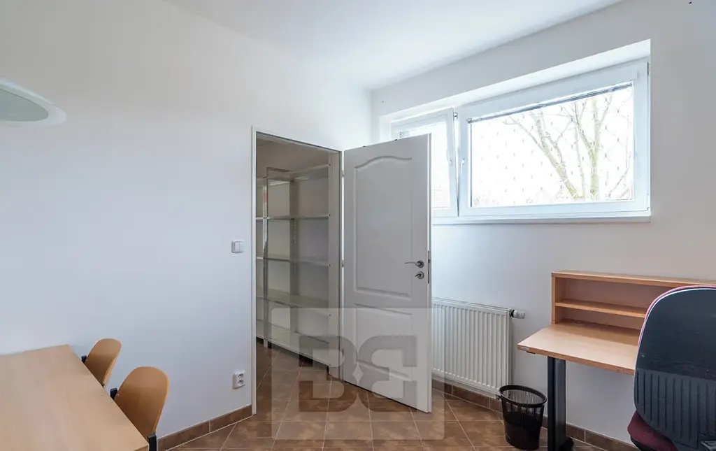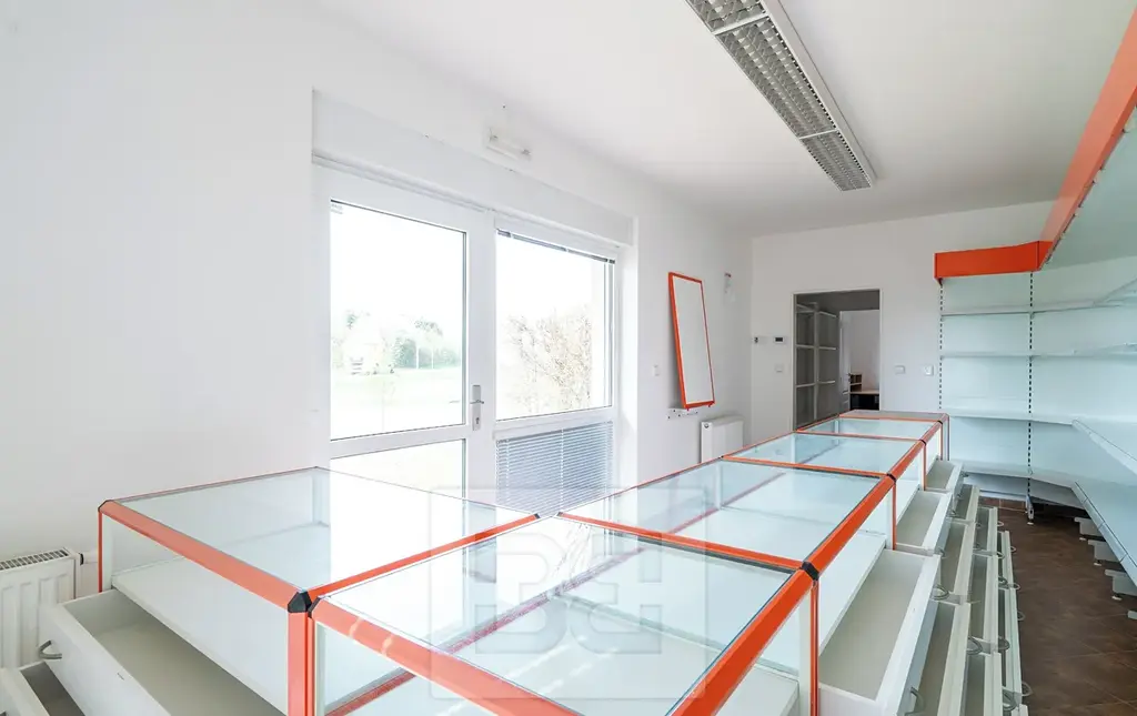 Hlavní prodejní či pracovní plocha plynule přechází do zadní části, kde se nachází samostatná malá kancelář s kuchyňkou. Dále se zde nachází plnohodnotná koupelna vybavená sprchovým koutem a toaletou.