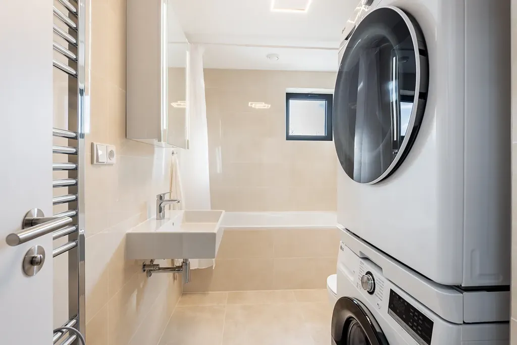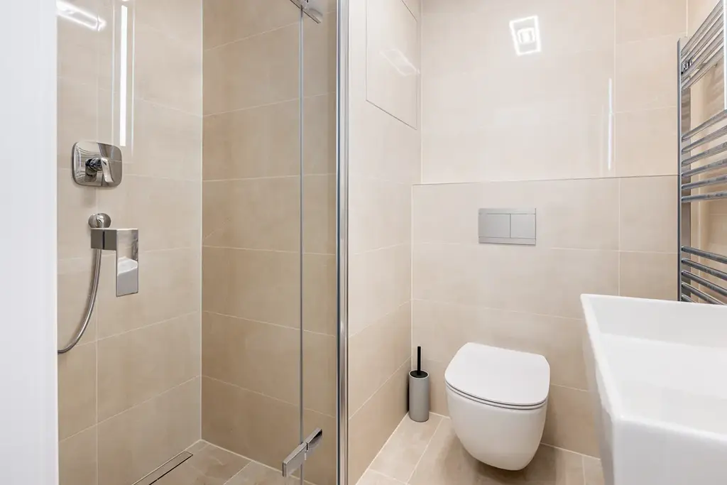 Po vstupu do bytu se nachází první koupelna s vanou, toaletou a pračkou se sušičkou. Dále projdete kolem hlavní ložnice (master bedroom), která disponuje šatnou a vlastní koupelnou se sprchovým koutem a toaletou.