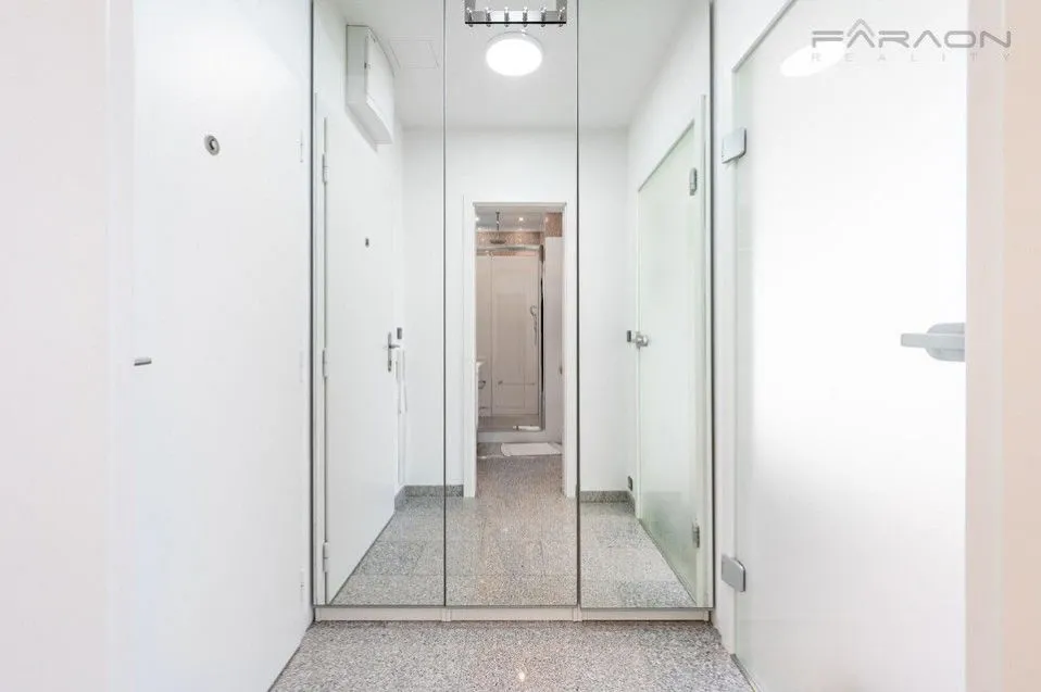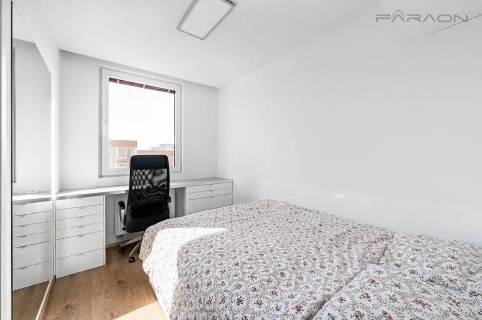Dispozici tvoří obývací pokoj s plně vybaveným kuchyňským koutem (myčka, trouba, mikrovlnná trouba, indukční deska, digestoř, lednice, pračka se sušičkou), ložnice s manželskou postelí a pracovním koutem, koupelna se sprchovým koutem a toaletou a předsíň. Byt je navržen s důrazem na maximální komfort, funkčnost a dostatek úložných prostor. Součástí bytu je splitová klimatizace a ambientní LED osvětlení. K bytu náleží sklepní kóje.