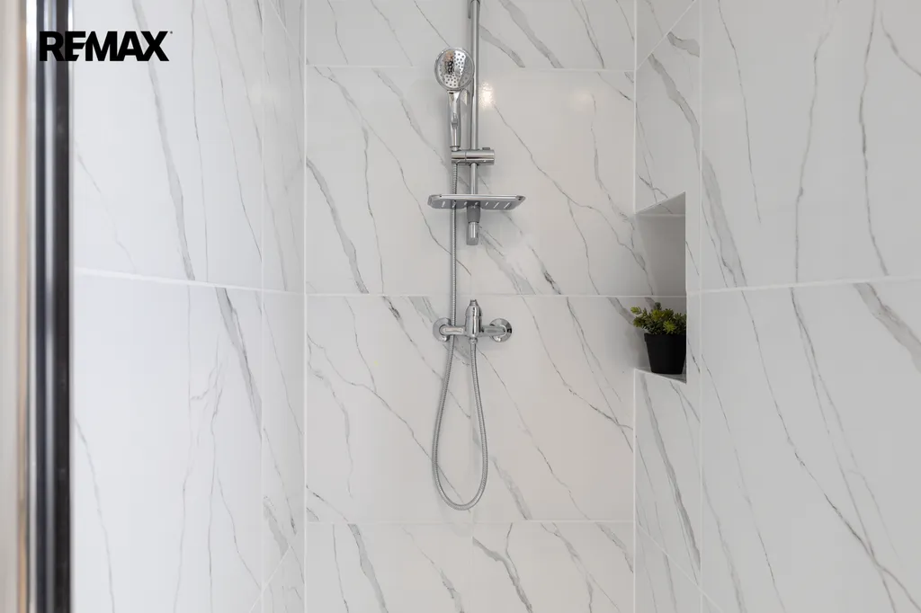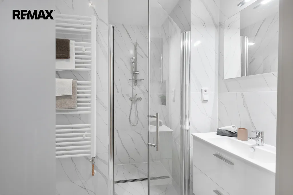 ✅ Koupelna s WC zděná, světle šedé moderní obklady, sprchový kout pro příjemnou koupel, umývadlová skříňka