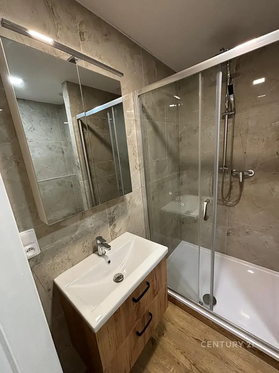 • Stylová koupelna se sprchovým koutem, velkoformátovými obklady se vzorem mramoru, novým sanitárním vybavením, skříňkou pod i nad umyvadlo a WC