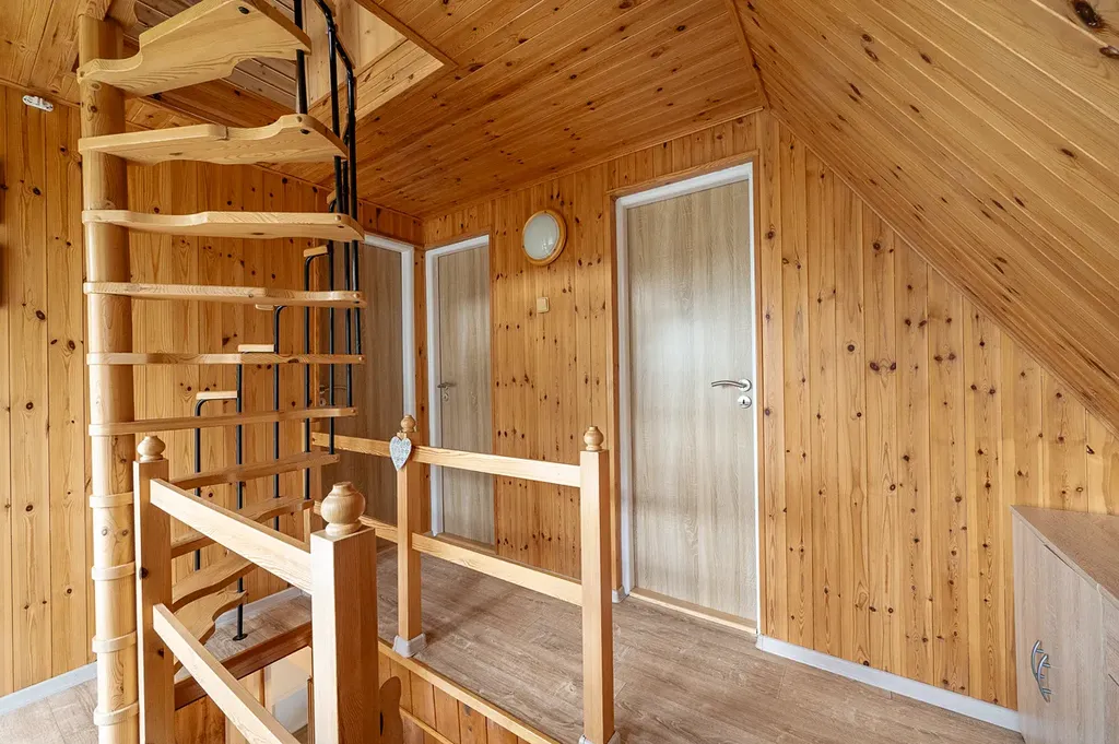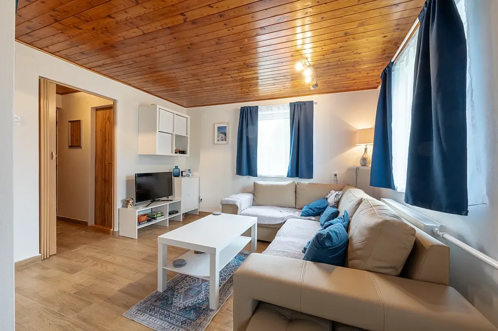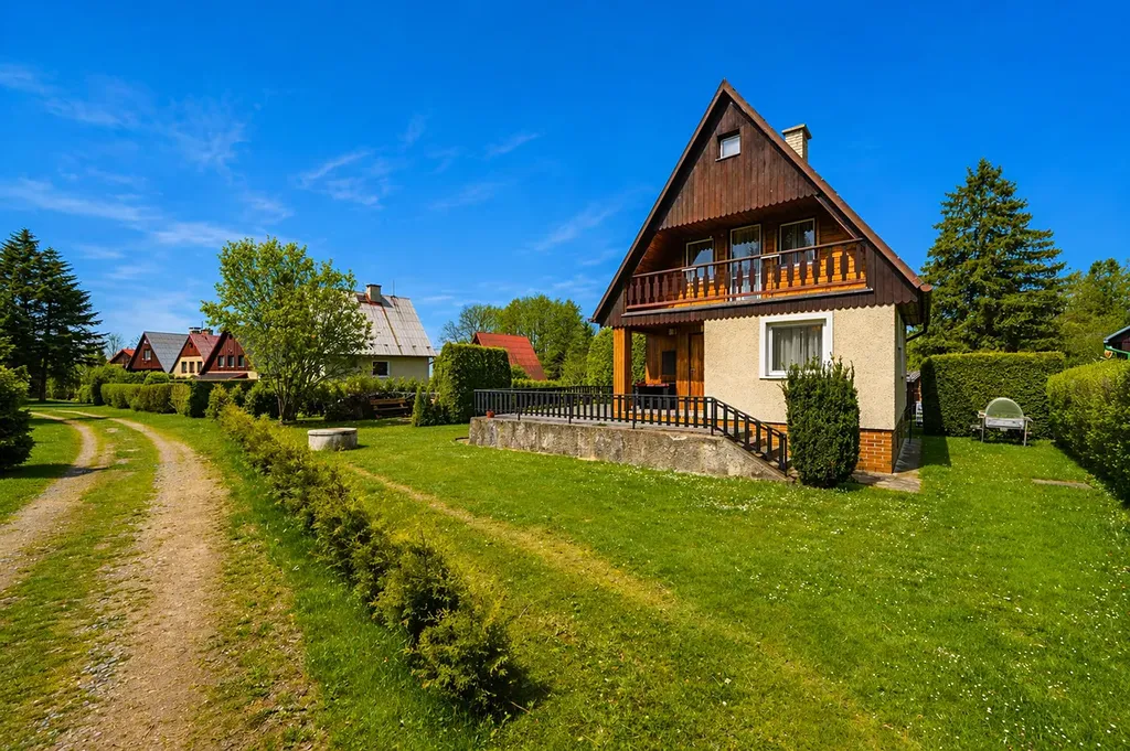Díky své dispozici a zázemí může nemovitost sloužit nejen jako rekreační objekt, ale bez problému také pro celoroční bydlení. Chata je řešena ve třech obytných úrovních. V přízemí se nachází vstupní část, koupelna, samostatné WC, kuchyně, jídelna a příjemný obývací prostor. V patře jsou tři samostatné ložnice a balkon s krásným výhledem do okolní krajiny. Další užitný prostor nabízí obytné podkroví o výměře cca 20 m², které lze využít jako pracovnu či k přespání pro návštěvy. Ve sklepě je pak umístěno technické a provozní zázemí – např. dílna, kotelna, a prostor na uskladnění dřeva.