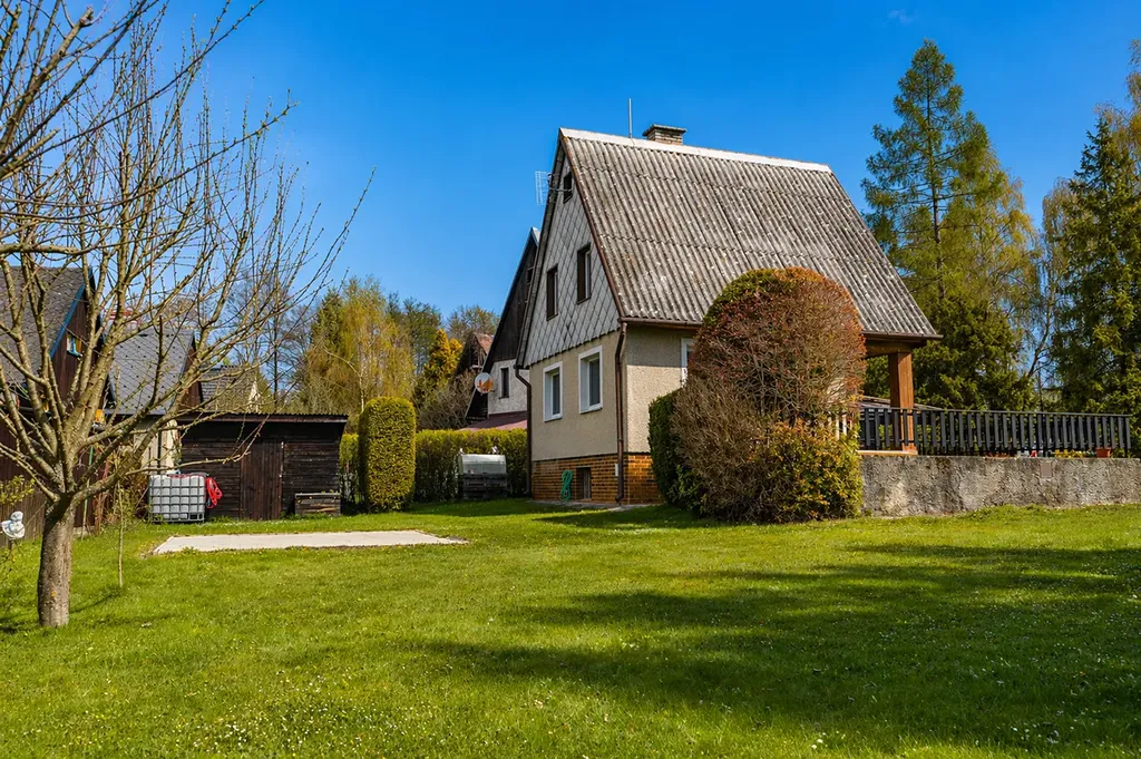 Pozemek kolem chaty je udržovaný, plný zeleně a vzrostlých ovocných stromů, které dotvářejí velmi příjemnou atmosféru celého místa. K dispozici je také samostatný dřevěný sklad vhodný pro uložení nářadí, sekačky, zahradního vybavení či sportovních potřeb.
