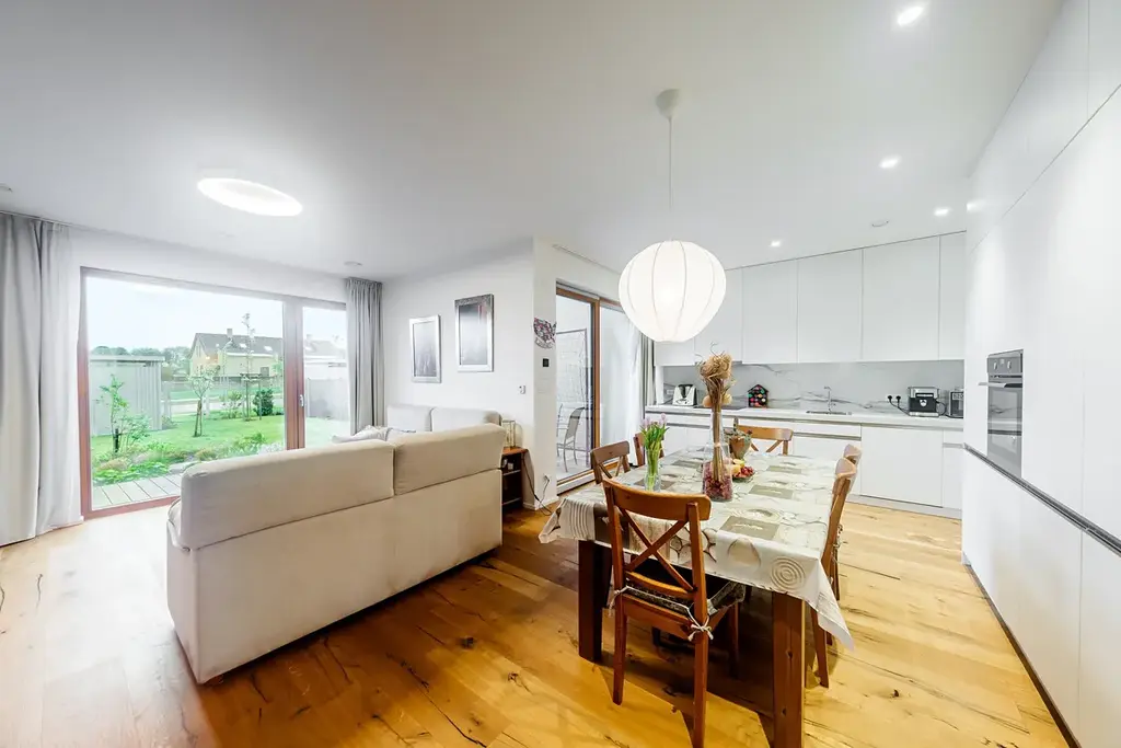 Vysoký standard vybavení: dřevěné podlahy, dřevěná okna s trojskly.