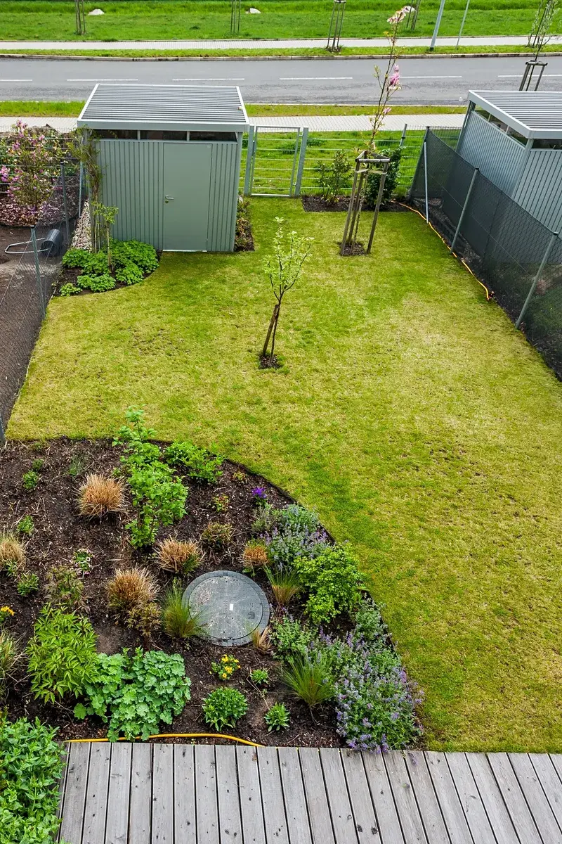 Útulná zahrada s terasou, zahradním domkem.