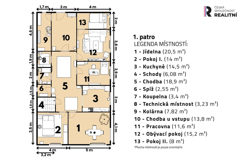 1. patro (cca 130 m²) s dispozicí 5+1 se 3 komorami je ideální na bydlení pro rodinu s dětmi