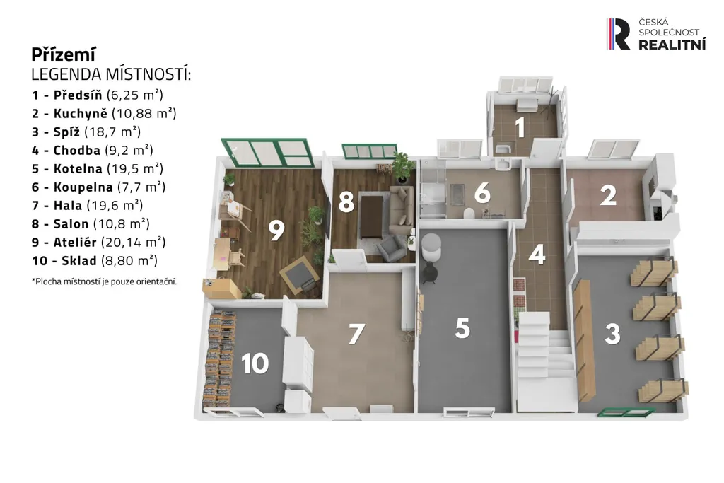 Přízemí (cca 130 m²) tvoří technické zázemí (sklep, kotelna, prádelna, sklady) a možnost vybudování samostatné bytové jednotky nebo atelieru či kanceláře